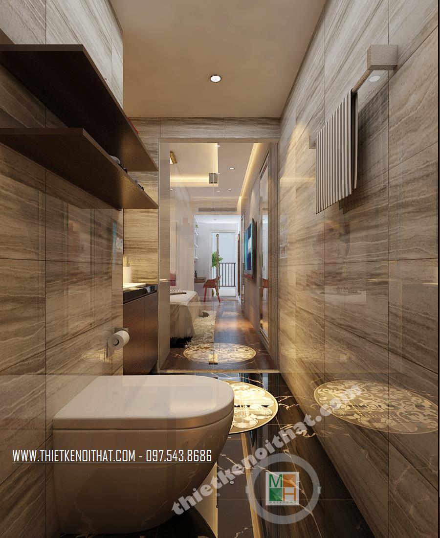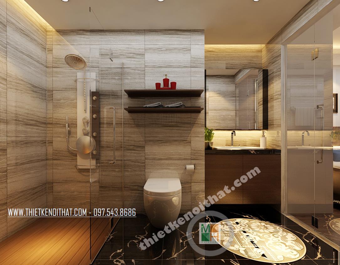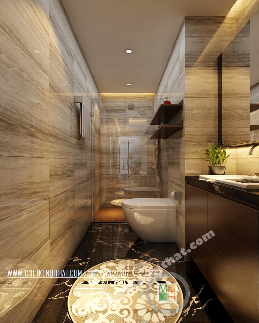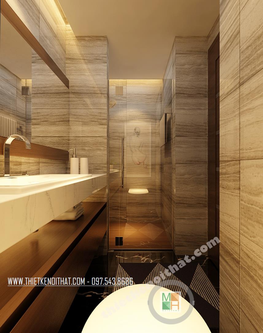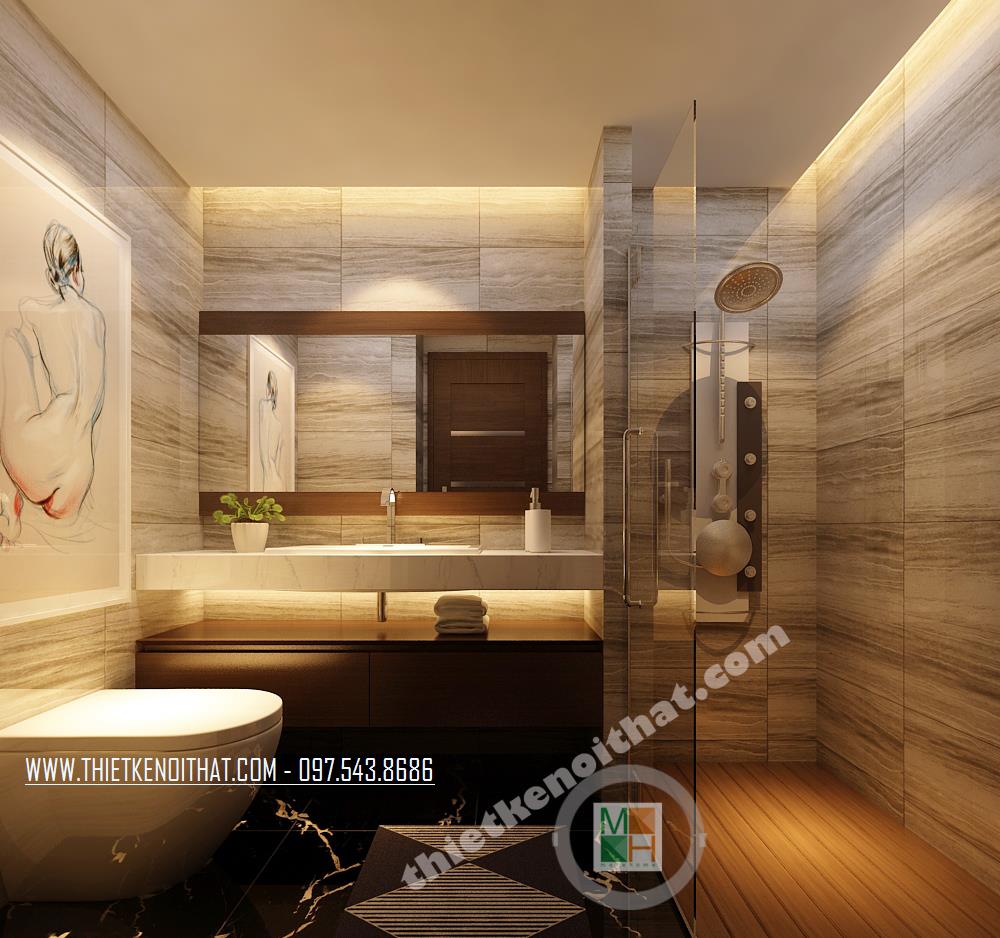 Thiết kế buồng tắm tập trung vào các chi tiết đá tông trầm và thiết kế kính thủy tinh tất cả đều giúp không gian trở nên rộng hơn đồng thời tận dụng các khoảng nhỏ mà tinh tế để các ngăn, hộc tủ. Chi tiết bức tranh giúp căn buồng trở nên sống động hơn.