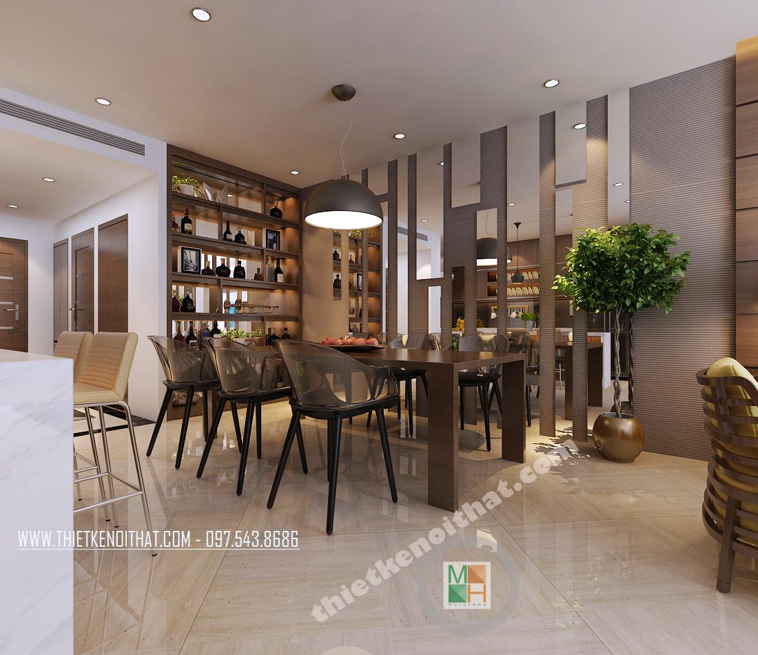 Khu vực bàn ăn nằm kề phòng khách với thiết kế tường gương đẩy không gian rộng hơn và thoáng hơn, chi tiết chậu cây cũng là một điểm nhấn thú vị giúp cho không gian thoải mái và thiên nhiên hơn. Kệ để giá rượu cũng là một ấn tượng thông minh khi lồng ghép trong thiết kế âm tường vừa tận dụng không gian vừa làm mới mẻ căn phòng.