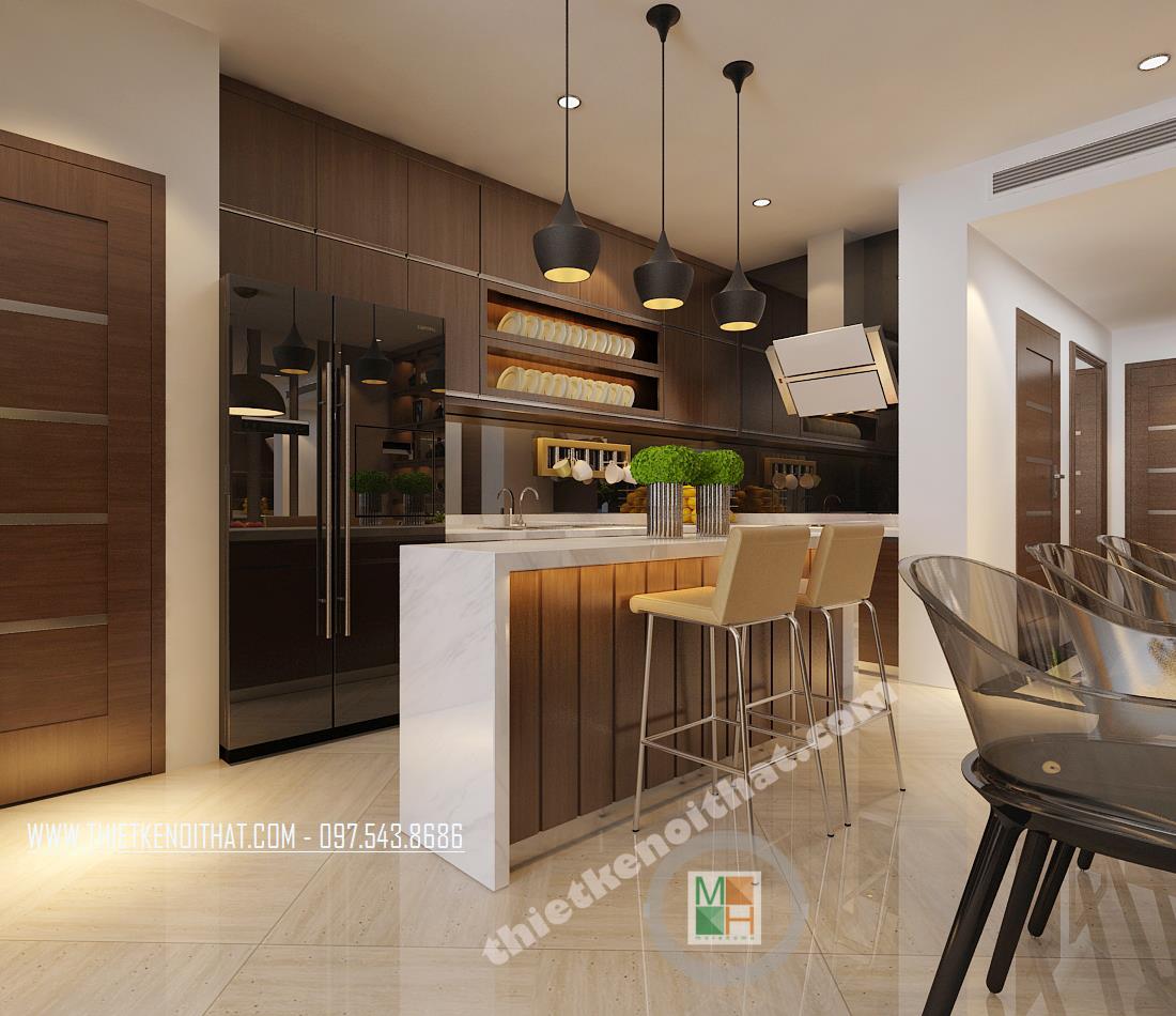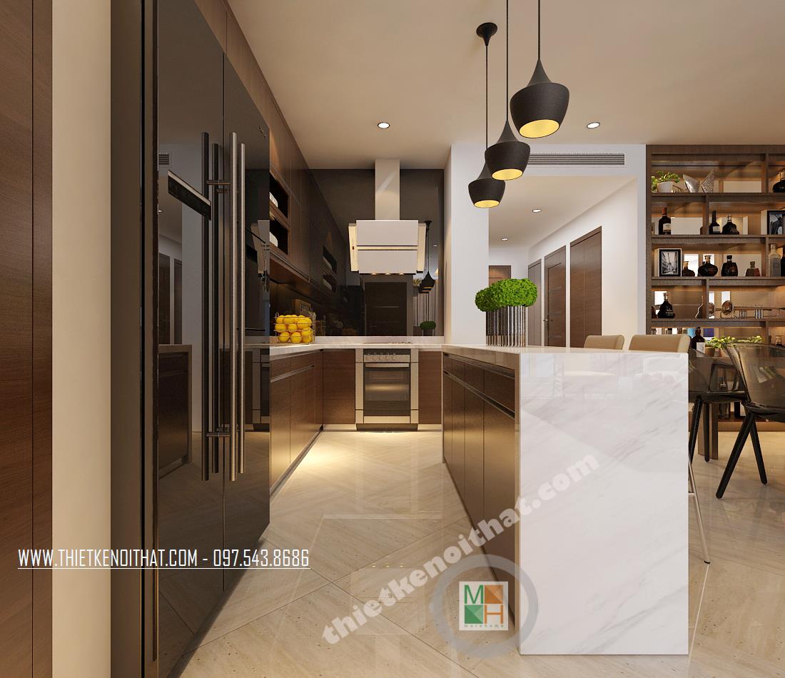Thiết kế nhà bếp mở và tông màu nâu đen trầm giúp sáng không gian và tạo sự sạch sẽ, thoải mái mang đến màu sắc lạ và thân thiện cho căn phòng. Kệ để đồ cũng được tận dụng làm kệ quầy bar giúp cho bạn vừa có thể nấu nướng vừa có thể trò chuyện với người thân ngay trong không gian bếp, một thiết kế phá cách ấn tượng mang hơi hướng Âu hóa cho căn nhà.