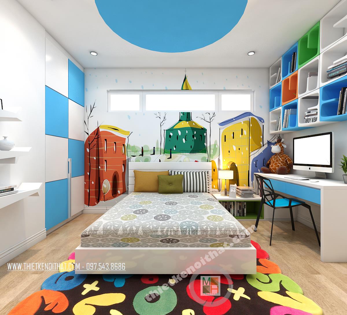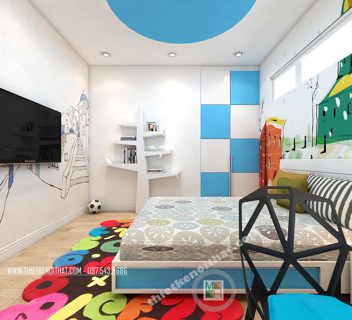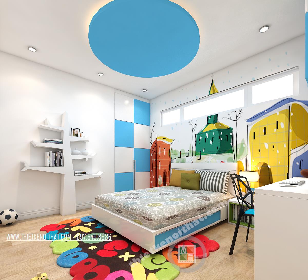 Phòng ngủ của bé gần như tách biệt với không gian lịch lãm, tinh tế ngòa kia mà hòa với sắc xanh và tường vẽ tạo nên không khí sáng tạo kích thích trí tưởng tượng của trẻ nhỏ. Các chi tiết phụ như giá để sách hay ghế cũng được thiết kế lạ mắt kích thích trẻ tư duy và phát triển.