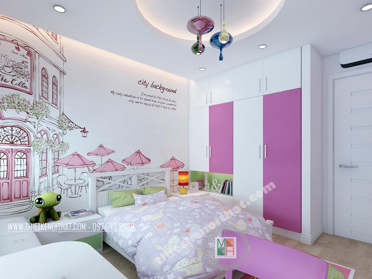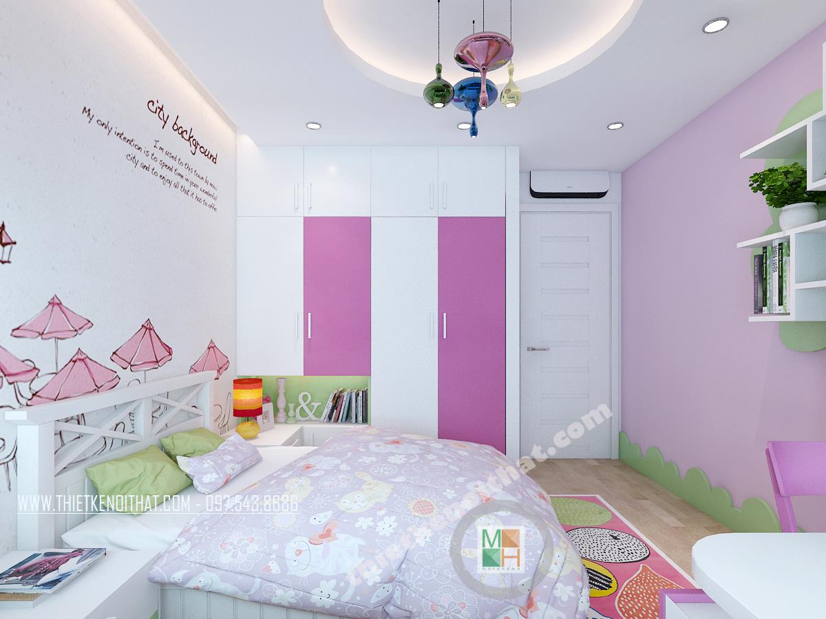 Phòng ngủ bé gái cũng được thiết kế theo cá tính trẻ với màu hồng là tông chủ đạo nhưng không mang cảm giác sến mà gợi về sự nhẹ nhàng, nữ tính trong sáng và thoải mái. Thiết kế tủ âm tường cùng các chi tiết đều được sử dụng tông màu trắng giúp căn phòng sáng và rộng. Giá để sách cũng được thiết kế sáng tạo kết hợp cùng đèn phòng phong cách lạ.