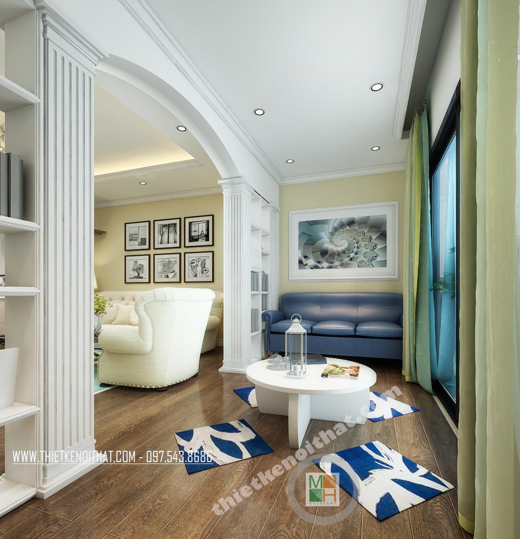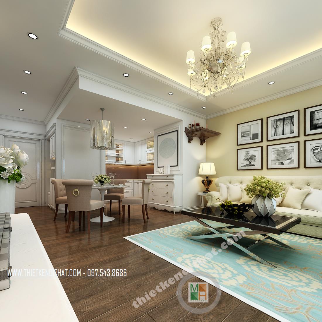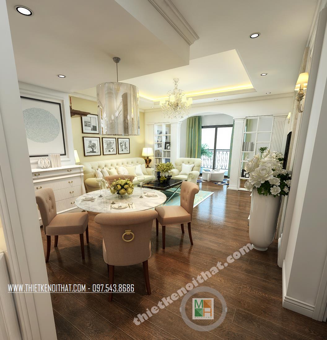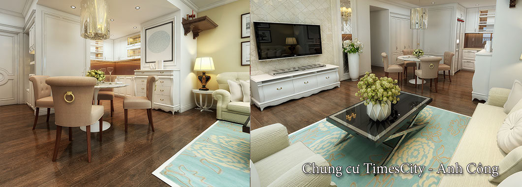 Đây là một trong những thiết kế khá ấn tượng mang phong cách nội thất tân cổ điển nằm trong khu căn hộ cao cấp TimesCity. Thiết kế nhấn mạnh đến các đường nét kiến trúc tinh tế và nhẹ nhàng mang đến cảm giác sang trọng và thư giãn cho gia chủ. Với đặc điểm của kiến trúc theo phong cách cổ điển nhấn mạnh đến các đường cong tinh tế và các chi tiết trang trí cầu kỳ, sự cân xứng của các mảng kết hợp với nét phóng khoáng hiện đại tạo ra một không gian đơn giản, tiện nghi nhưng vẫn thể hiện được sự sang trọng, quí tộc mà không quá rối mắt. Bên cạnh đó, căn hộ có 2 tông màu là tông màu vàng kem tươi sáng mang lại cảm giác thân thiện hoặc tông màu xanh dương trẻ trung để gia chủ có thể lựa chọn, tùy theo sở thích riêng của cá nhân.