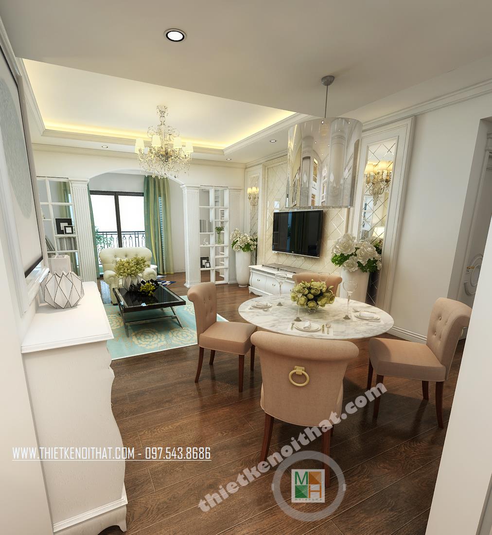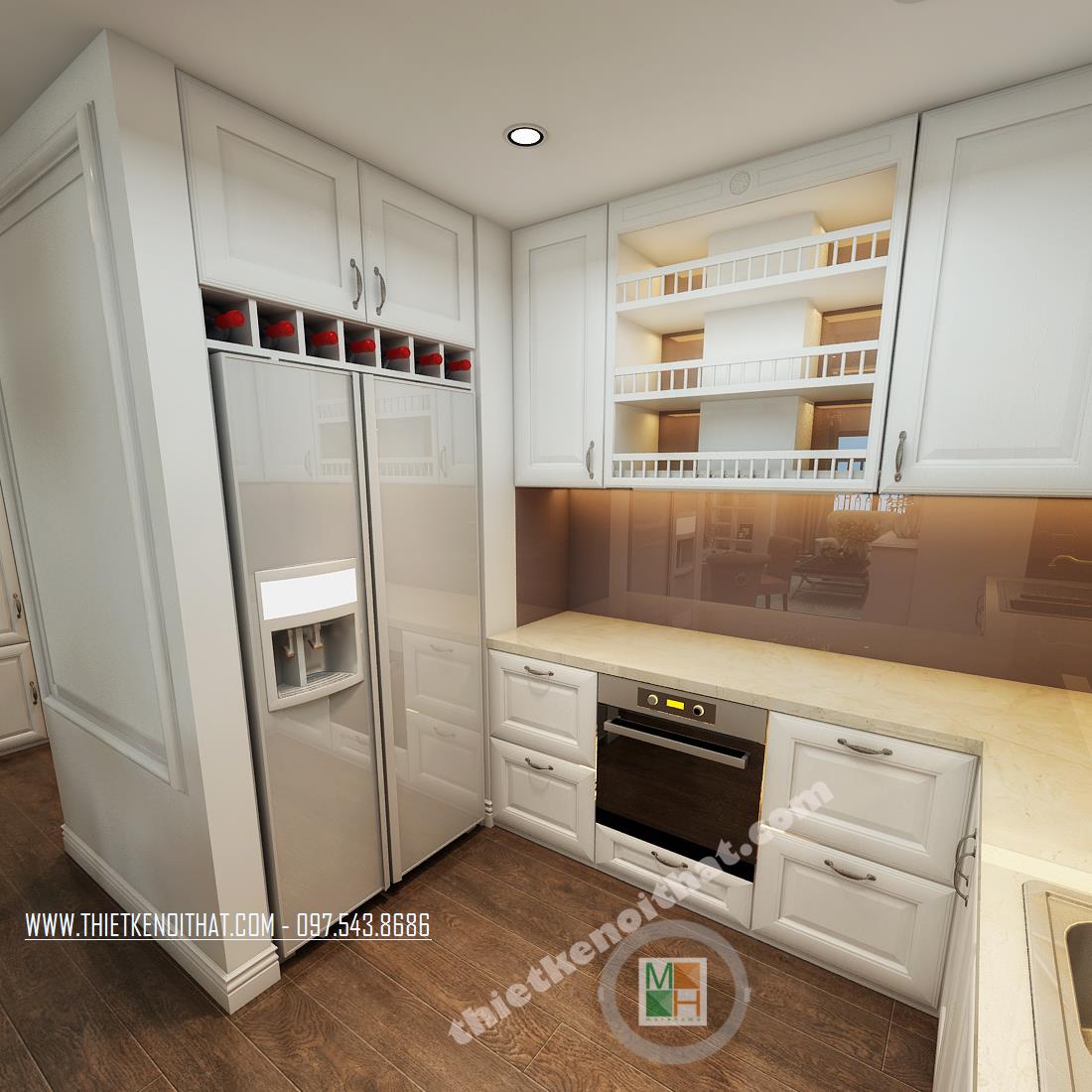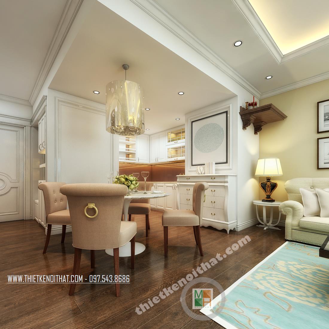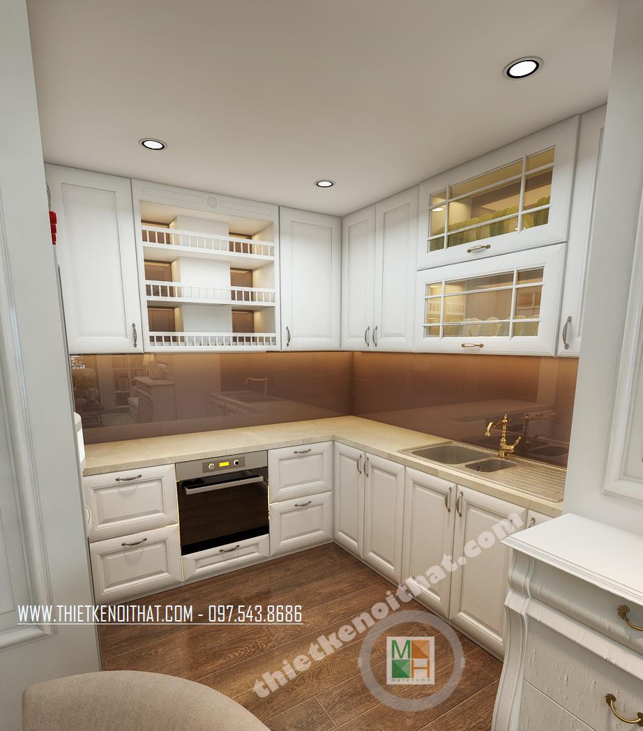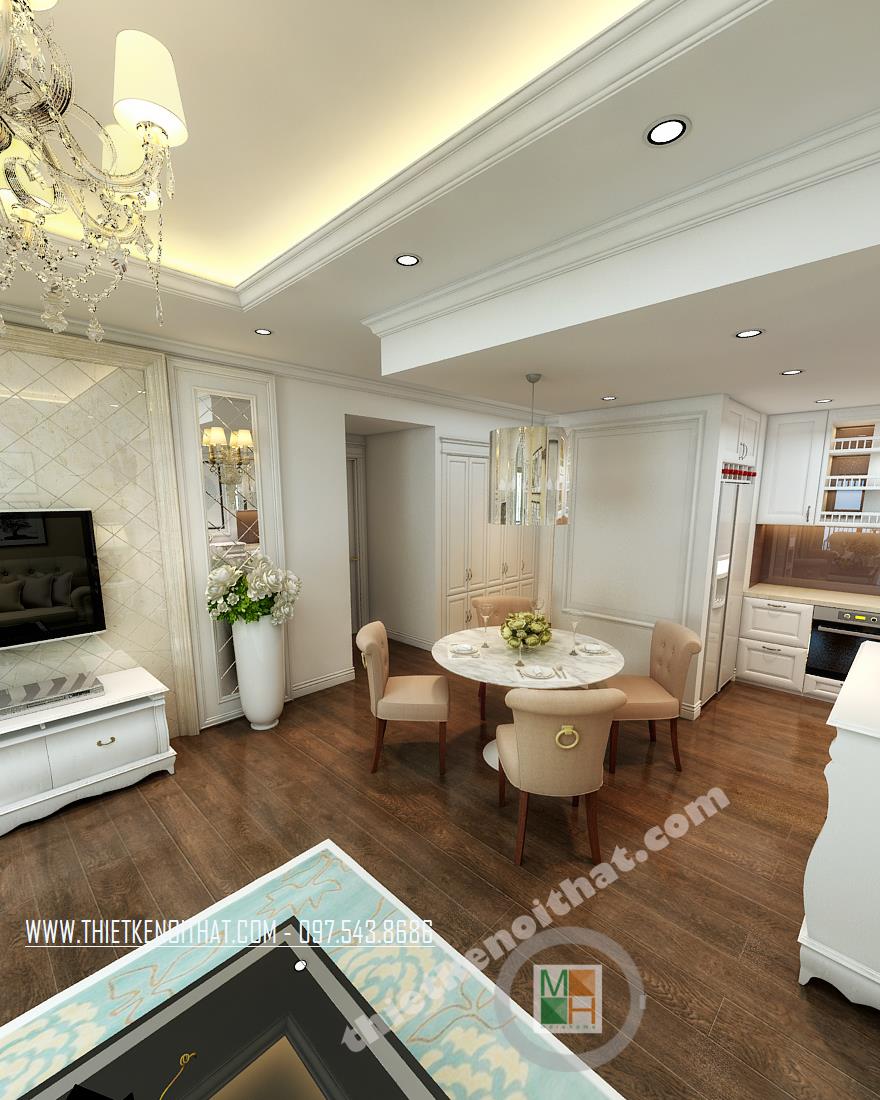 Thiết kế nội thất phòng bếp tân cổ điển với nhược điểm là diện tích khá nhỏ vì vậy thiết kế bếp và phòng ăn liền kề tạo sự liên kết, độ mở cho không gian cũng như mang lại bầu không khí ấm áp, quây quần cho căn hộ. Các đồ nội thất thiết kế phòng ăn – bếp được bố trí một cách hợp lí. Mặt bếp sử dụng đá marble màu sáng kết hợp với tủ bếp trắng, đặc biệt hơn là hệ tủ trên thiết kế các cánh tủ thoáng chia ô tỉ lệ cân đối tạo nên cảm giác thanh thoát tinh tế. Không gian bếp được tận dụng tối đa với các thiết kế tủ kệ đơn giản, đảm bảo được công năng, thẩm mỹ nhưng không ảnh hưởng đến diện tích sử dụng.