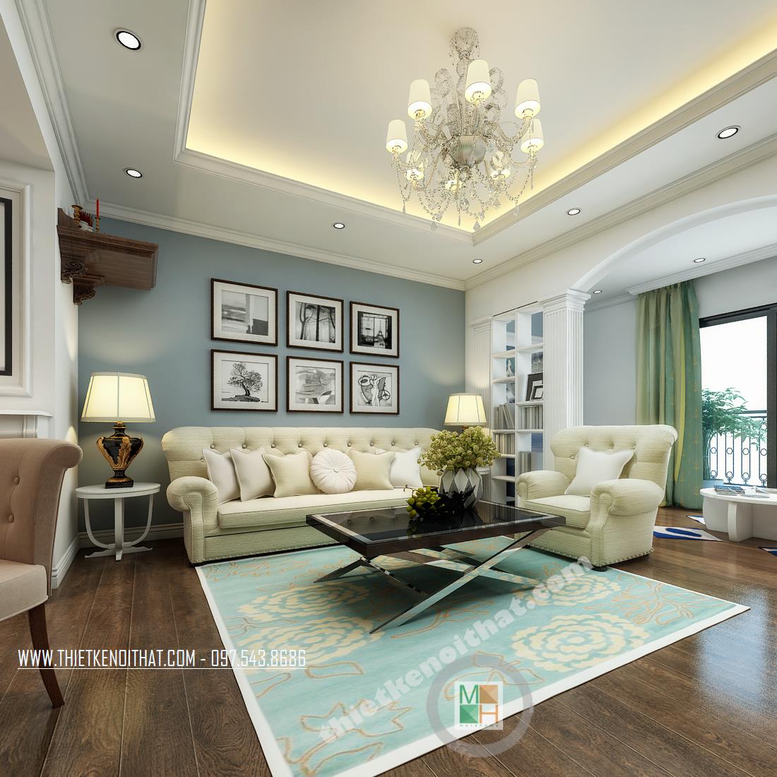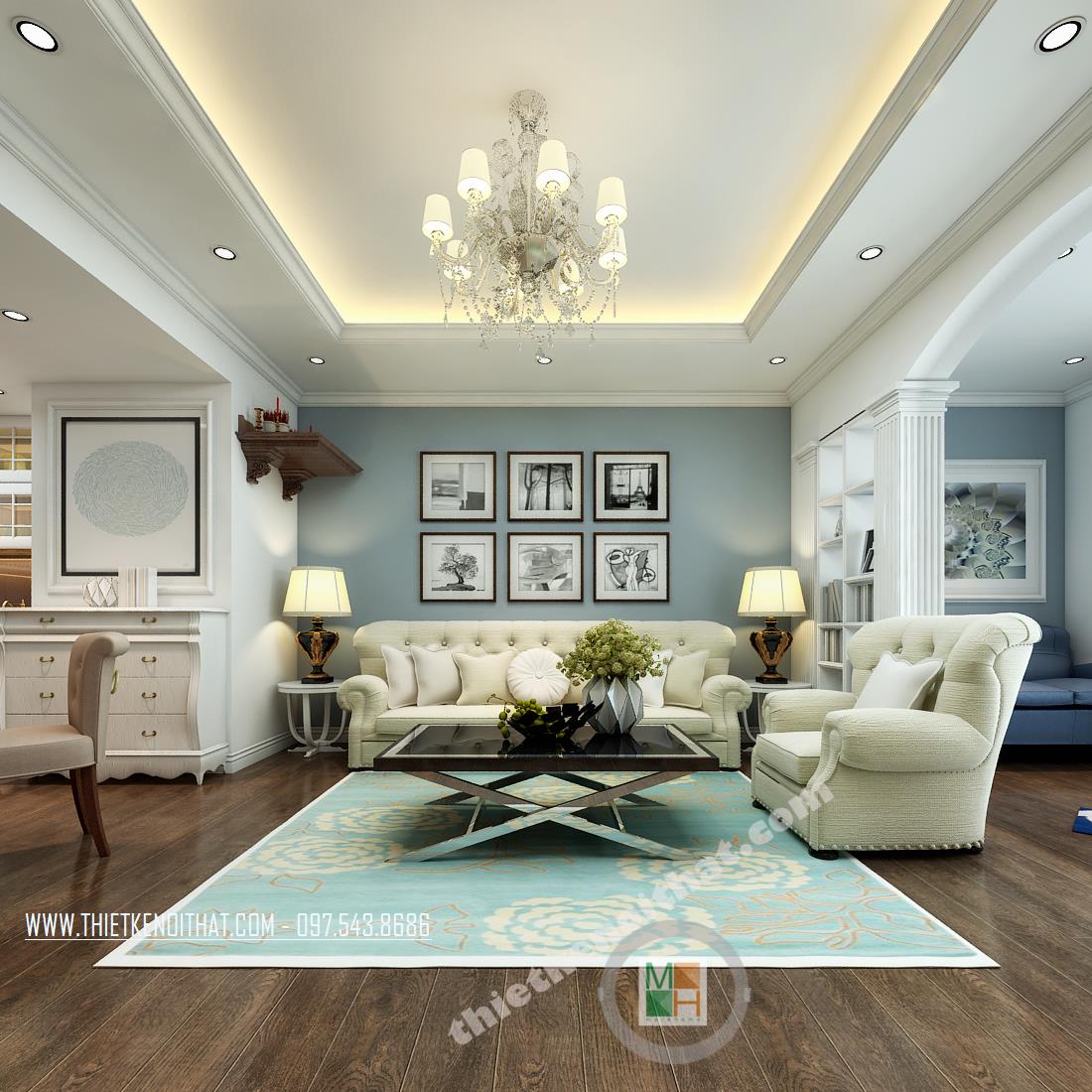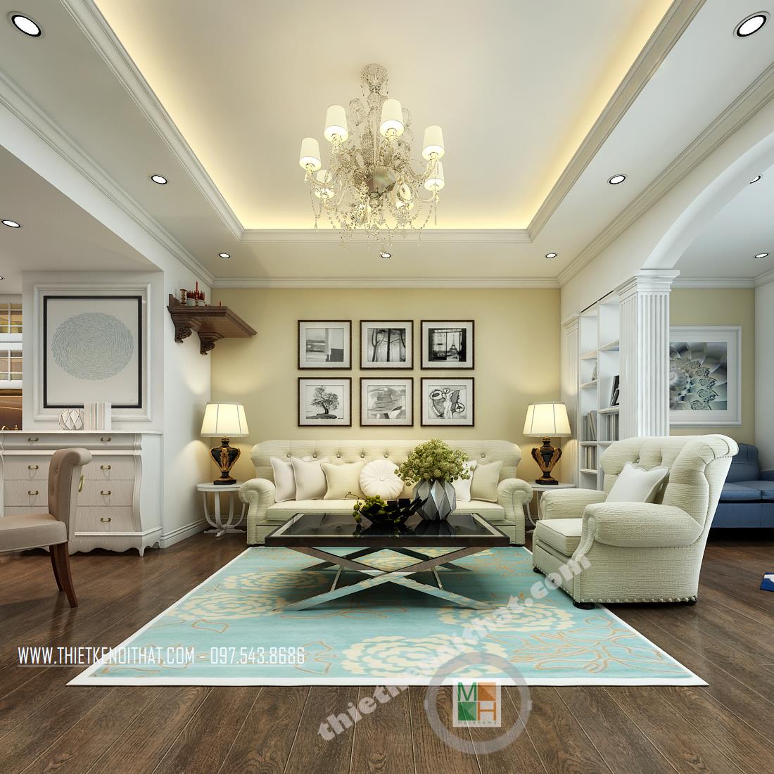 Thiết kế nội thất tân cổ điển phòng khách lấy tông màu trắng làm chủ đạo làm nổi bật sự sang nhã của căn nhà. Bộ sofa đơn sắc với các đường cong nhẹ nhàng là điểm nhấn đặc biệt cho không gian phòng khách. Hệ thống đèn led âm trần chiếu sáng được phân bố hợp lý kết hợp cùng đèn chùm tạo giúp gia chủ tiết kiệm tối đa lượng điện năng và đảm bảo tính thẩm mỹ cho toàn bộ không gian phòng khách. Bên cạnh đó là một không gian nhỏ được thiết kế ngay cạnh phòng khách phù hợp để nghỉ ngơi, thư giãn. Được ngăn cách bởi thiết kế vách ngăn vừa tạo được sự riêng tư mà không gây cảm giác chật chội. Gia chủ có thể sử dụng vách ngăn cũng như một nơi lí tưởng làm giá sách, trưng bày đồ vật, tăng thẩm mĩ cho ngôi nhà. Ngoài ra, thiết kế đặc biệt kết hợp với cửa kính mở rộng ra ban công giúp tận dụng tối đa ánh sáng tự nhiên từ cửa sổ làm bừng sáng căn phòng và tạo độ mở cho không gian.