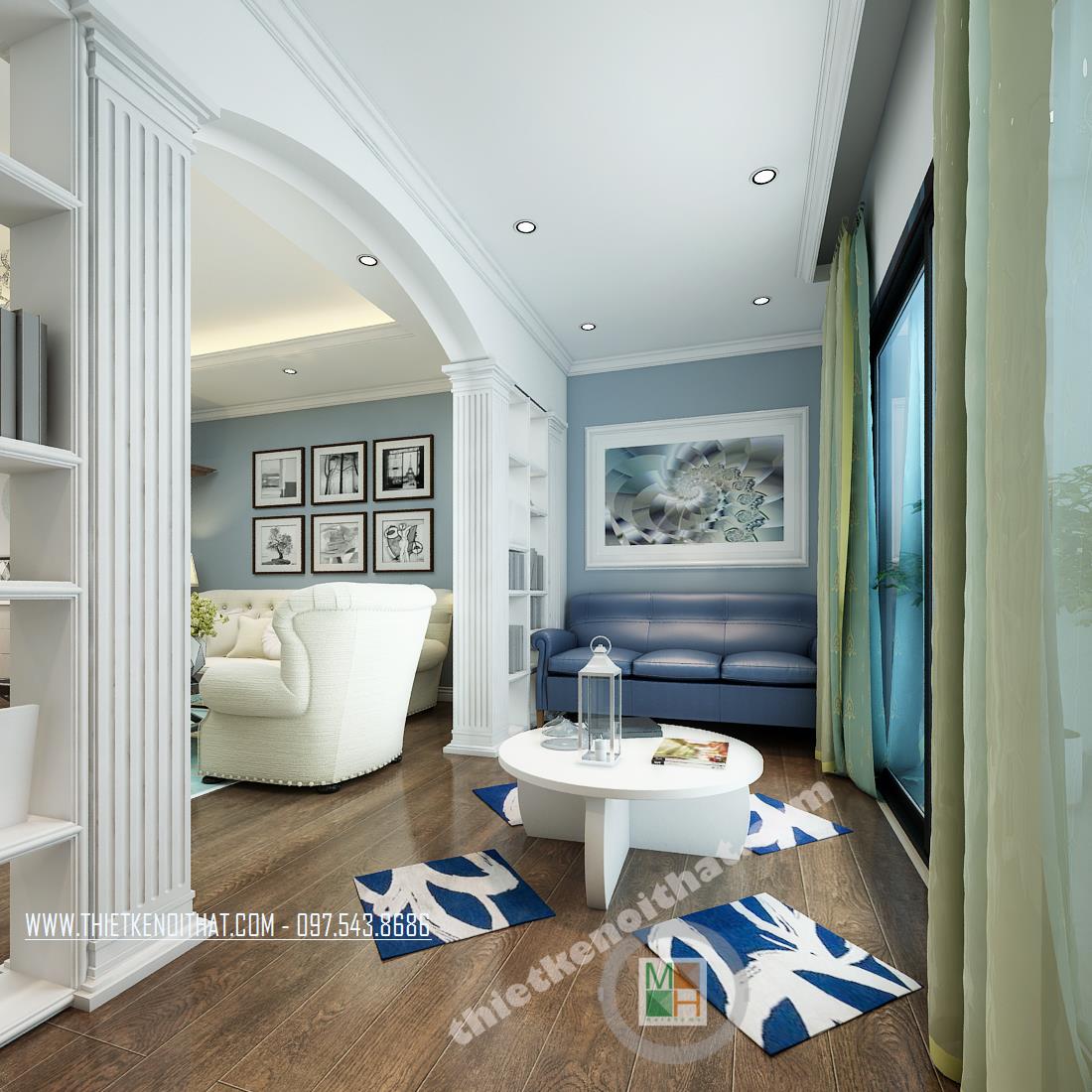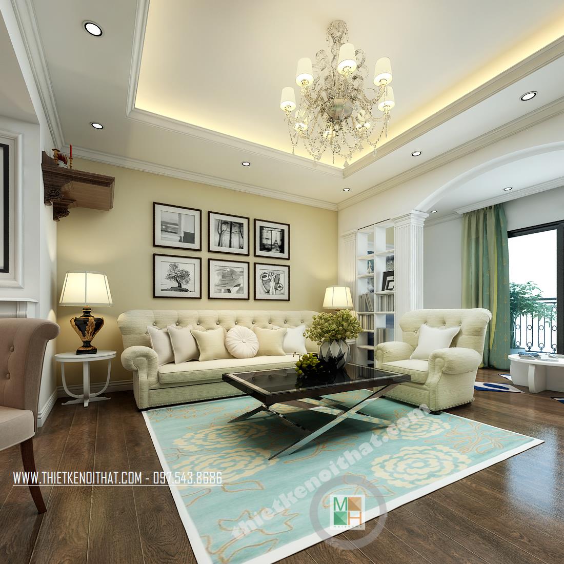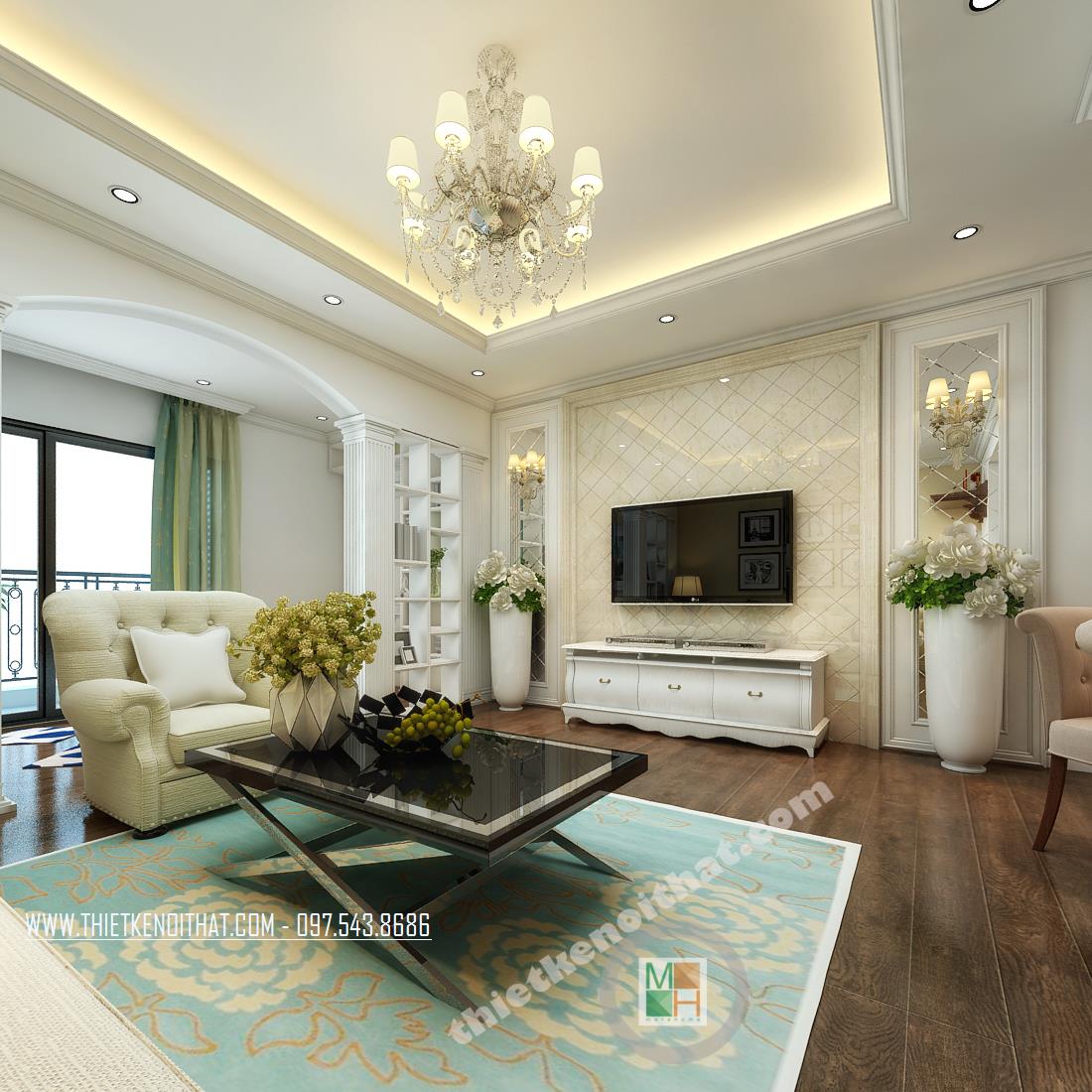Thiết kế nội thất tân cổ điển phòng khách lấy tông màu trắng làm chủ đạo làm nổi bật sự sang nhã của căn nhà. Bộ sofa đơn sắc với các đường cong nhẹ nhàng là điểm nhấn đặc biệt cho không gian phòng khách. Hệ thống đèn led âm trần chiếu sáng được phân bố hợp lý kết hợp cùng đèn chùm tạo giúp gia chủ tiết kiệm tối đa lượng điện năng và đảm bảo tính thẩm mỹ cho toàn bộ không gian phòng khách. Bên cạnh đó là một không gian nhỏ được thiết kế ngay cạnh phòng khách phù hợp để nghỉ ngơi, thư giãn. Được ngăn cách bởi thiết kế vách ngăn vừa tạo được sự riêng tư mà không gây cảm giác chật chội. Gia chủ có thể sử dụng vách ngăn cũng như một nơi lí tưởng làm giá sách, trưng bày đồ vật, tăng thẩm mĩ cho ngôi nhà. Ngoài ra, thiết kế đặc biệt kết hợp với cửa kính mở rộng ra ban công giúp tận dụng tối đa ánh sáng tự nhiên từ cửa sổ làm bừng sáng căn phòng và tạo độ mở cho không gian.