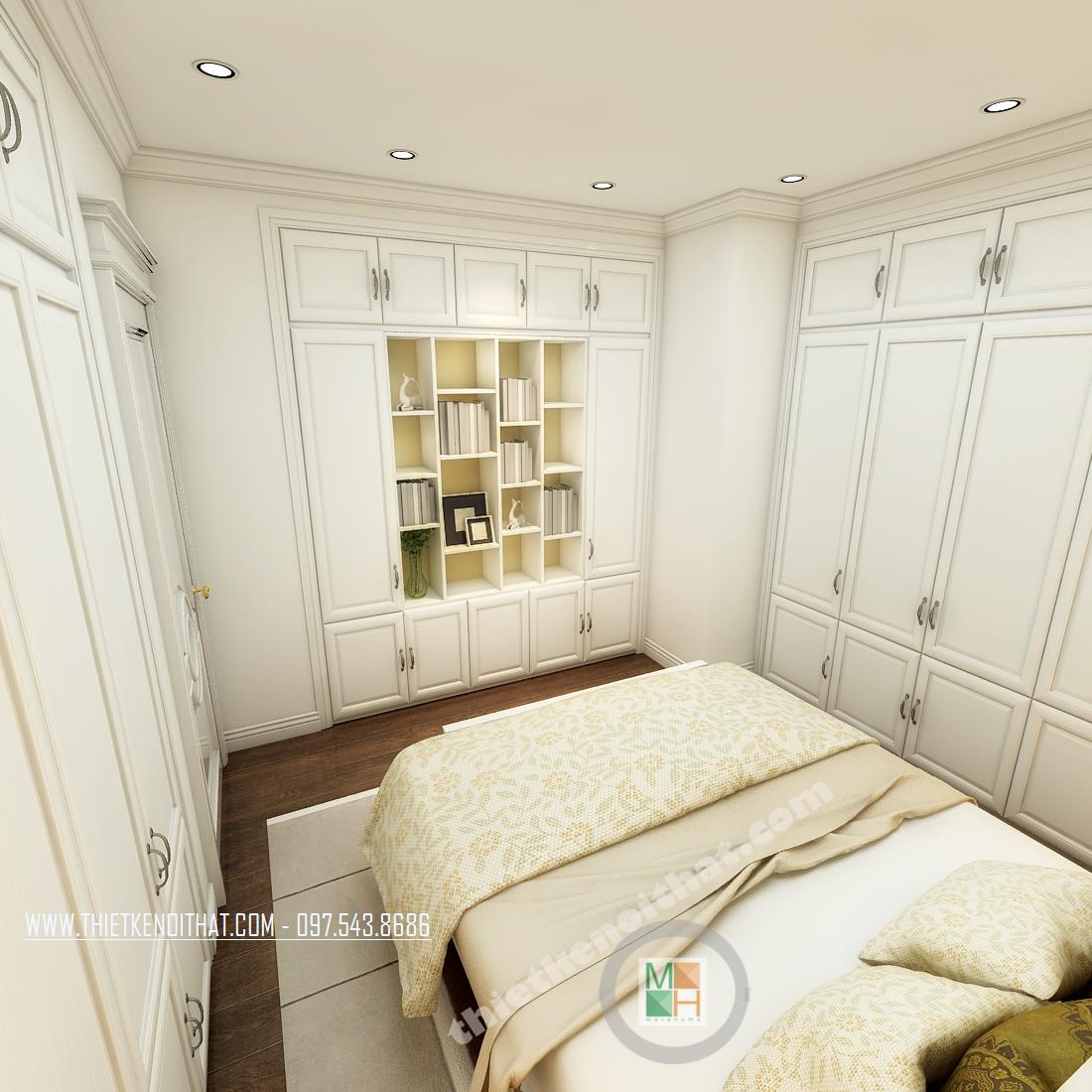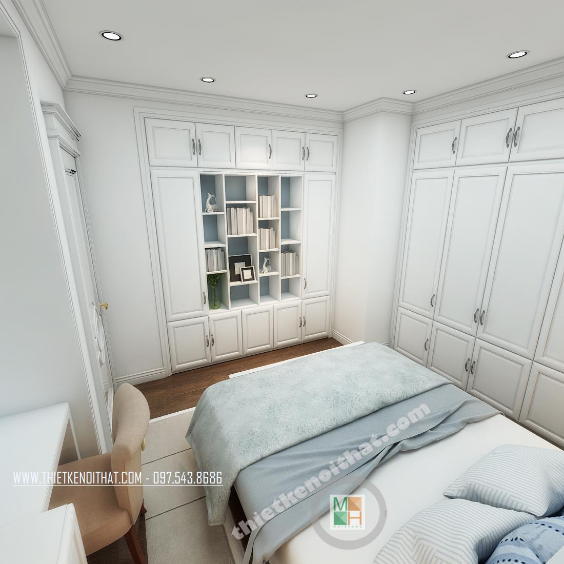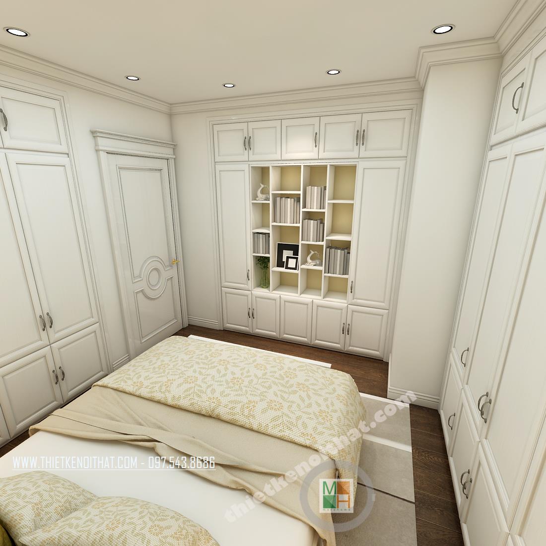 Thiết kế phòng ngủ nhỏ có diện tích nhỏ hẹp vì vậy kiến trúc sư đã sử dụng tông màu sáng cùng hệ thống tủ âm tường đứng khiến không gian trở nên cao và thoáng hơn, không bị bí bách, ngột ngạt cũng như giúp đảm bảo được những tiện nghi của một thiết kế phòng ngủ cần có mà vẫn mang được phong cách tân cổ điển cho không gian.