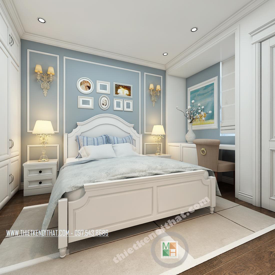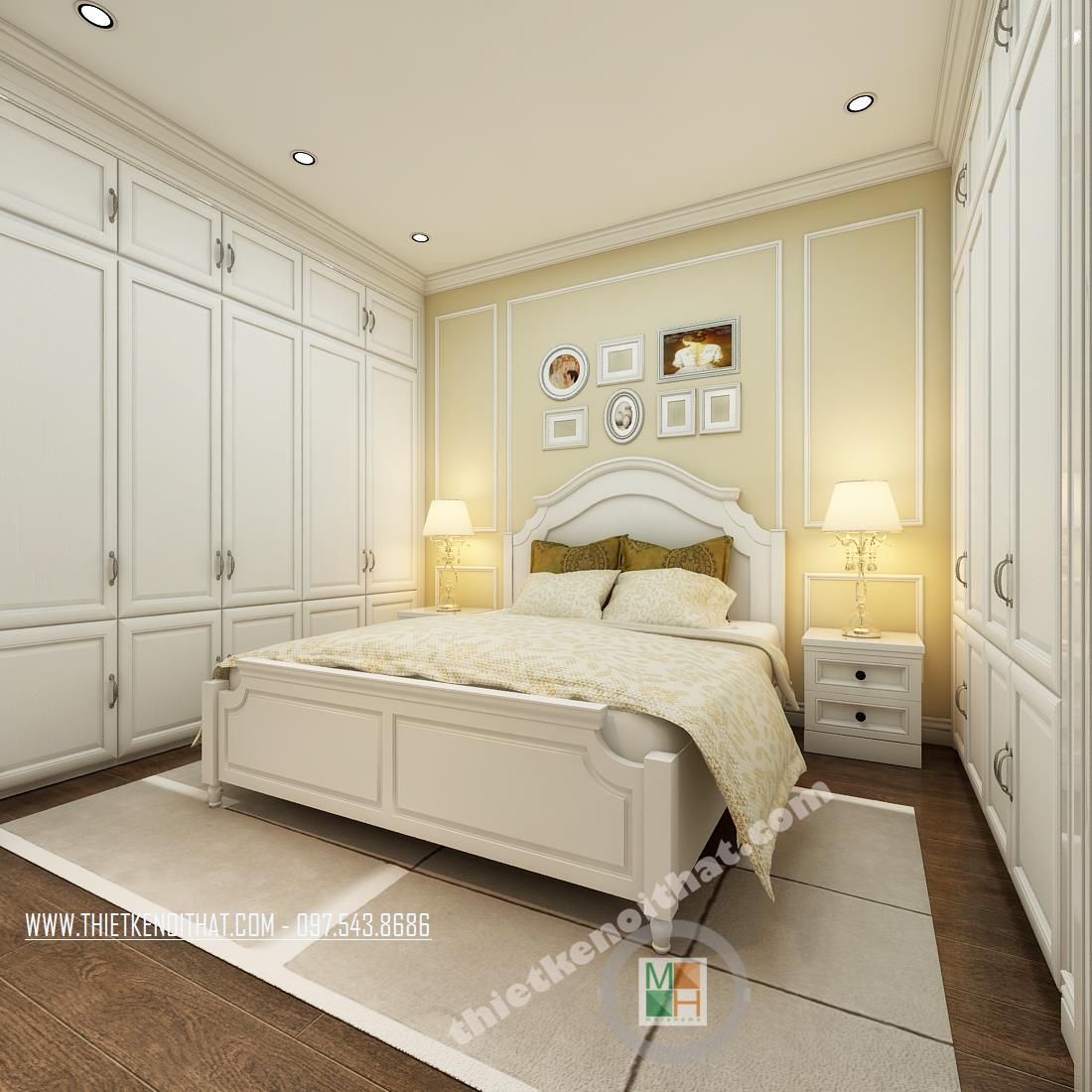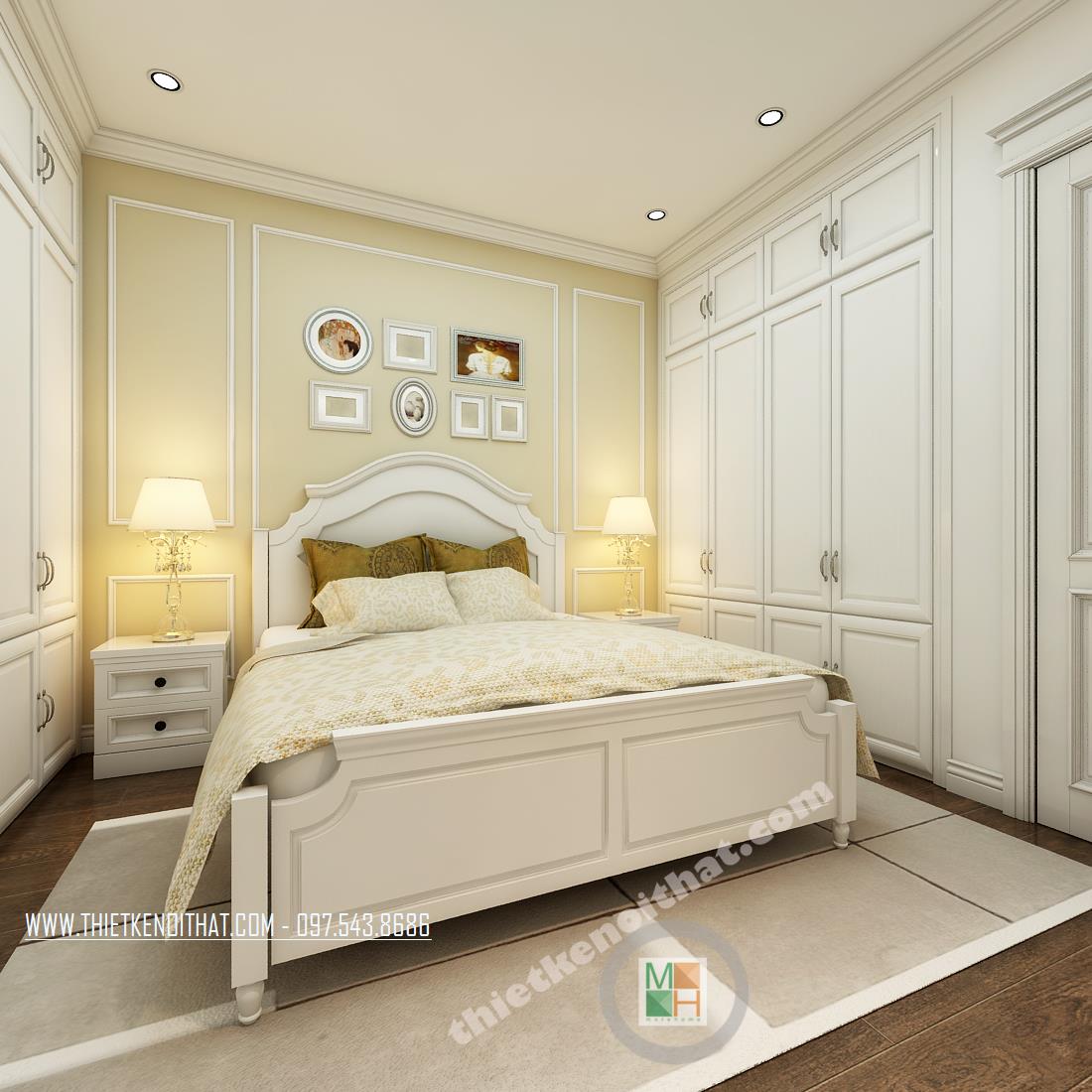 Thiết kế phòng ngủ nhỏ có diện tích nhỏ hẹp vì vậy kiến trúc sư đã sử dụng tông màu sáng cùng hệ thống tủ âm tường đứng khiến không gian trở nên cao và thoáng hơn, không bị bí bách, ngột ngạt cũng như giúp đảm bảo được những tiện nghi của một thiết kế phòng ngủ cần có mà vẫn mang được phong cách tân cổ điển cho không gian.