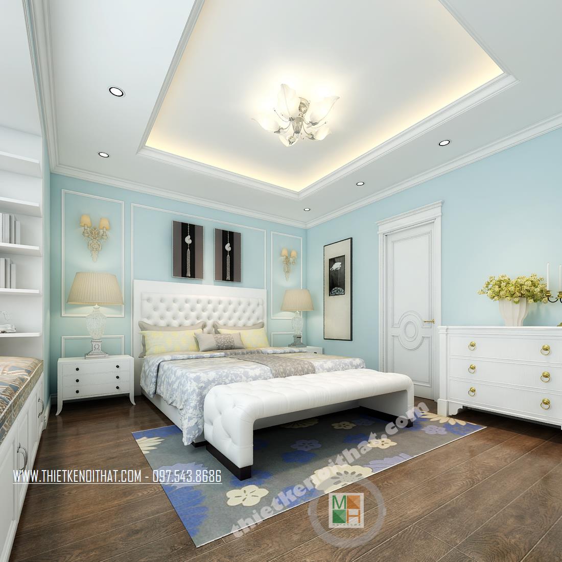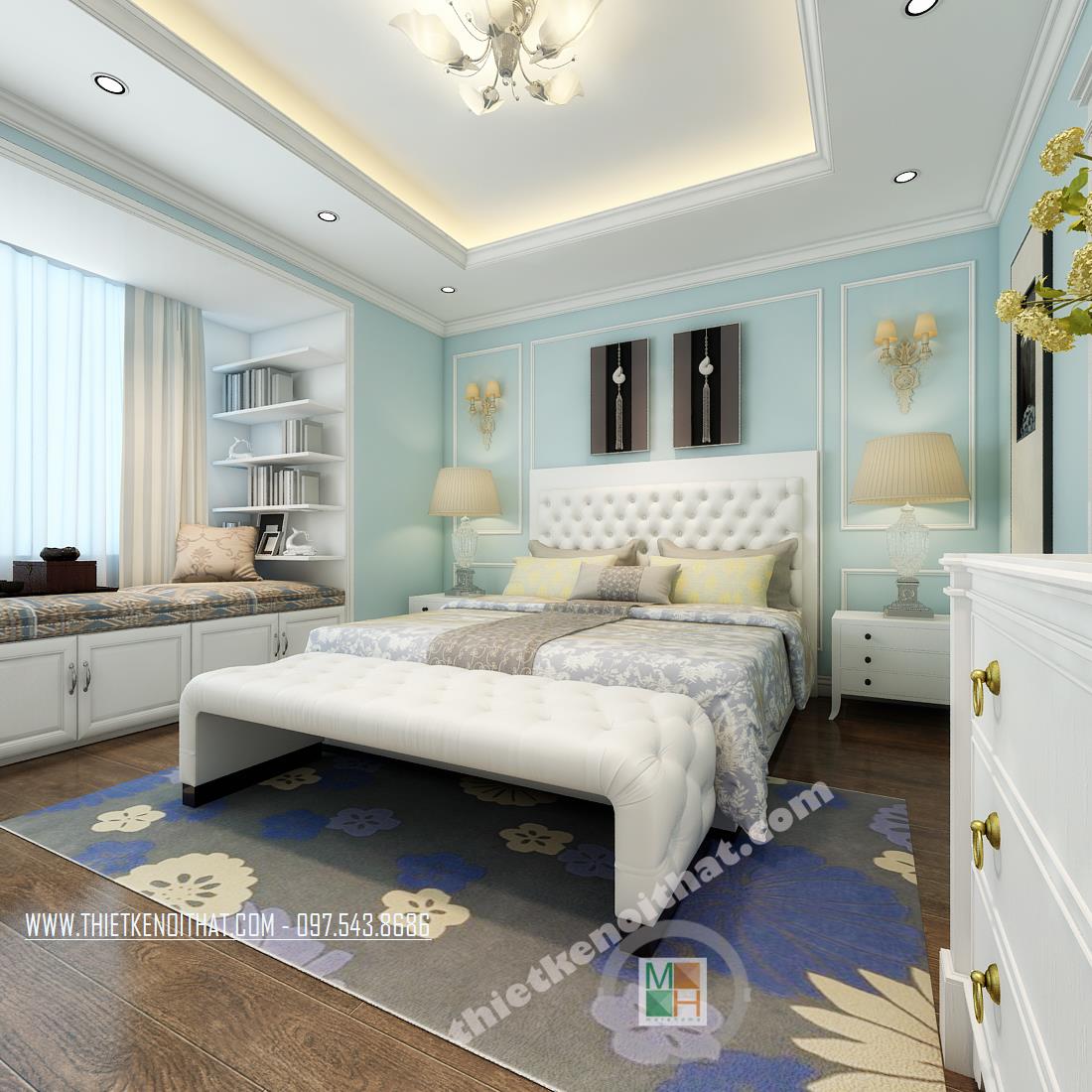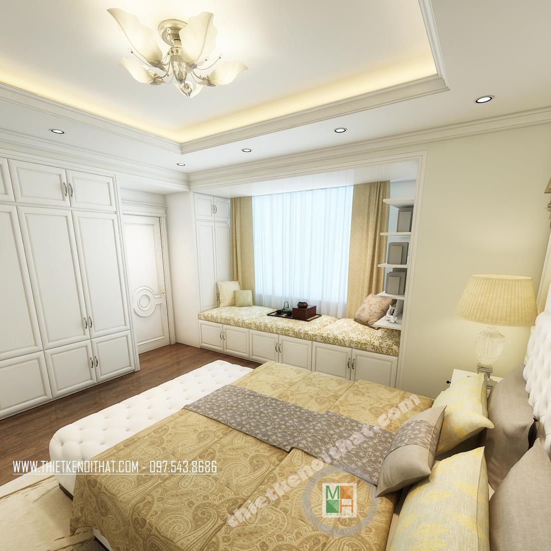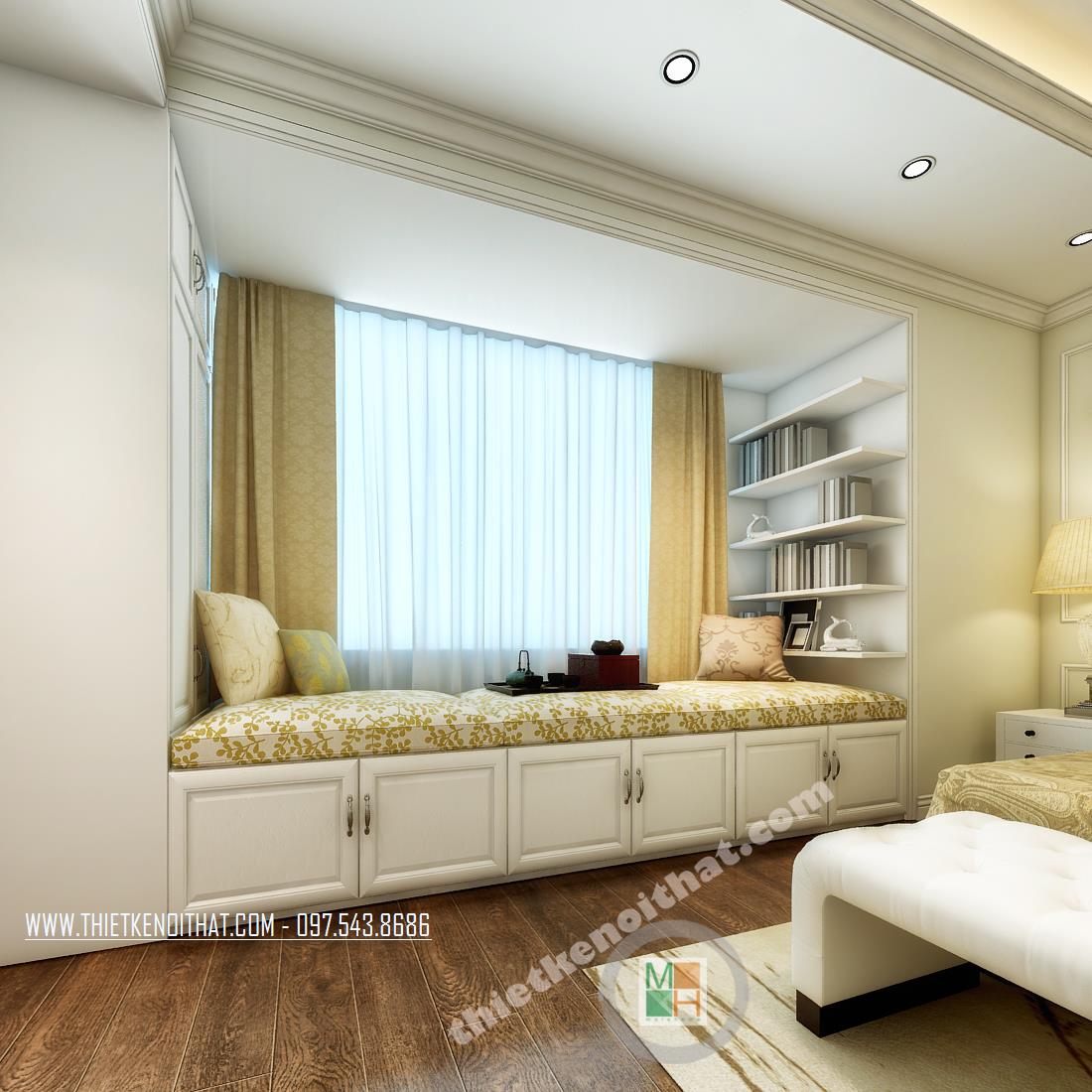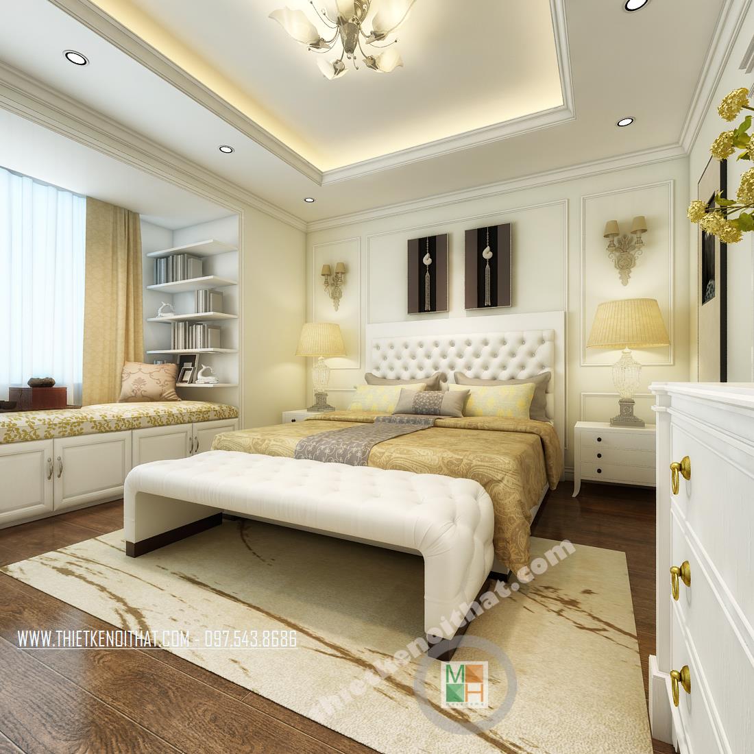 Thiết kế nội thất phòng ngủ lớn mang phong cách tân cổ điển sáng tạo. Tông màu được sử dụng chính là trắng và vàng kết hợp cùng với các mảng tường được phân chia theo tỉ lệ cân xứng mang đến cảm giác hài hòa và trang nhã cho căn phòng. Khung cửa sổ rộng vừa được tận dụng làm không gian đọc sách tiện nghi và thư giãn tạo độ mở, giúp không gian phòng ngủ trở nên thoáng và rộng rãi hơn. Đồ nội thất được lựa chọn hầu hết là các sản phẩm đa chức năng: ghế dài kết hợp tủ đồ, kệ đồ kết hợp giá sách …. mang lại không gian nghỉ ngơi, thư giãn thoải mái cho người sử dụng