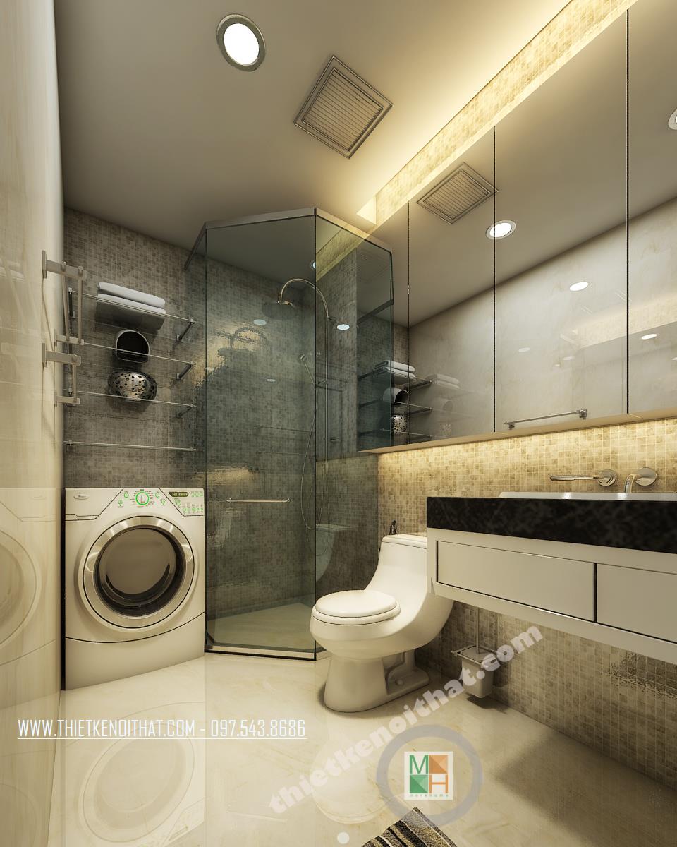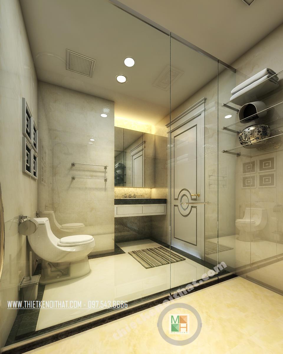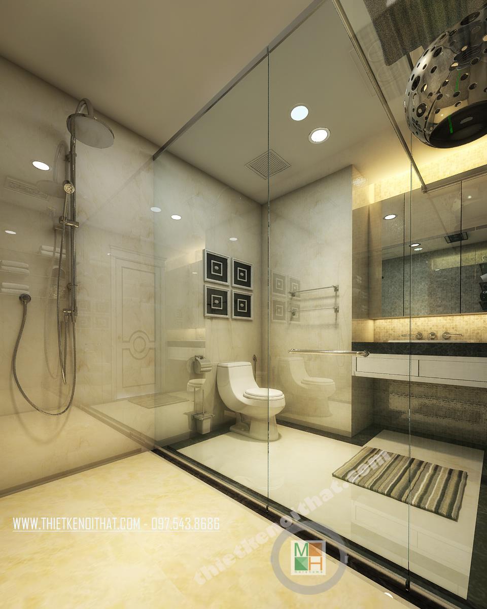 Thiết kế nội thất phòng tắm lựa chọn sàn và ốp tường đá cẩm thạch màu sáng cùng các đường bo viền tối tạo sự tương phản, tinh tế nhưng vẫn mềm mại cho không gian. Đặc biệt không gian được tách riêng biệt là khu khô và khu ướt bởi vách kính trong suốt giúp gia chủ tận dụng không gian, như máy giặt có thể gọn gàng tại khu khô của phòng tắm. Sự phối hợp giữa ánh sáng, gương và vách kính một cách hợp lý đã giúp cải thiện nhược điểm hẹp của phòng tắm, mang lại 1 không gian rộng rãi hơn nhưng vẫn đảm bảo được sự tiện nghi cũng như các tính năng của phòng tắm cho người sử dụng.