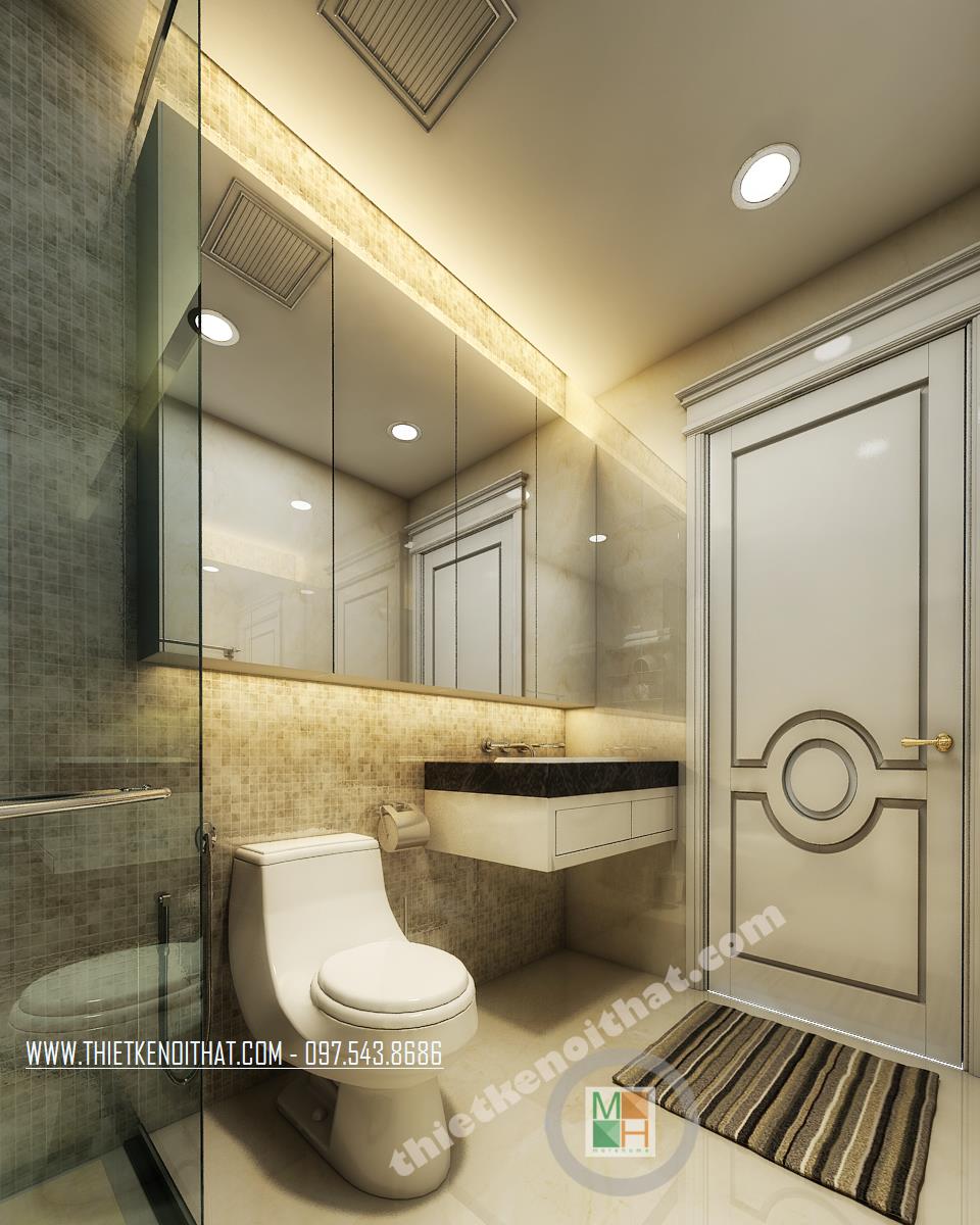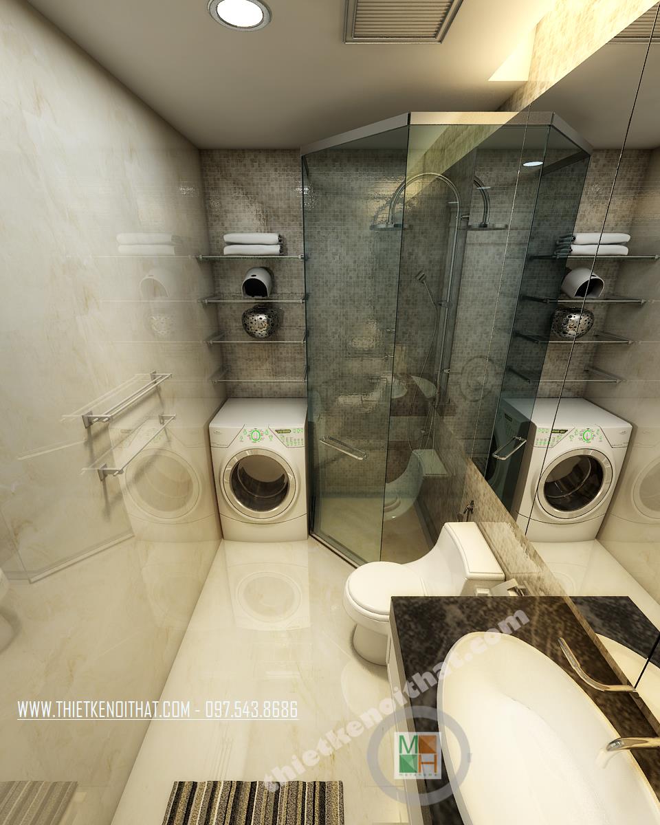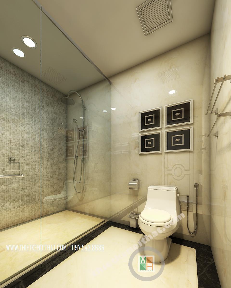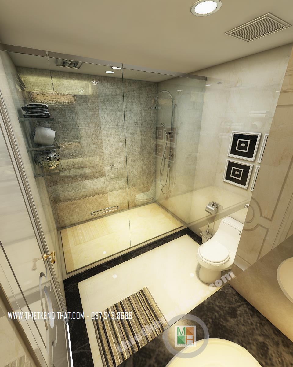 Thiết kế nội thất phòng tắm lựa chọn sàn và ốp tường đá cẩm thạch màu sáng cùng các đường bo viền tối tạo sự tương phản, tinh tế nhưng vẫn mềm mại cho không gian. Đặc biệt không gian được tách riêng biệt là khu khô và khu ướt bởi vách kính trong suốt giúp gia chủ tận dụng không gian, như máy giặt có thể gọn gàng tại khu khô của phòng tắm. Sự phối hợp giữa ánh sáng, gương và vách kính một cách hợp lý đã giúp cải thiện nhược điểm hẹp của phòng tắm, mang lại 1 không gian rộng rãi hơn nhưng vẫn đảm bảo được sự tiện nghi cũng như các tính năng của phòng tắm cho người sử dụng.