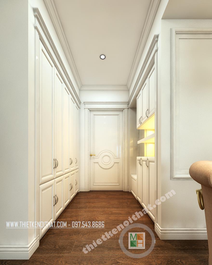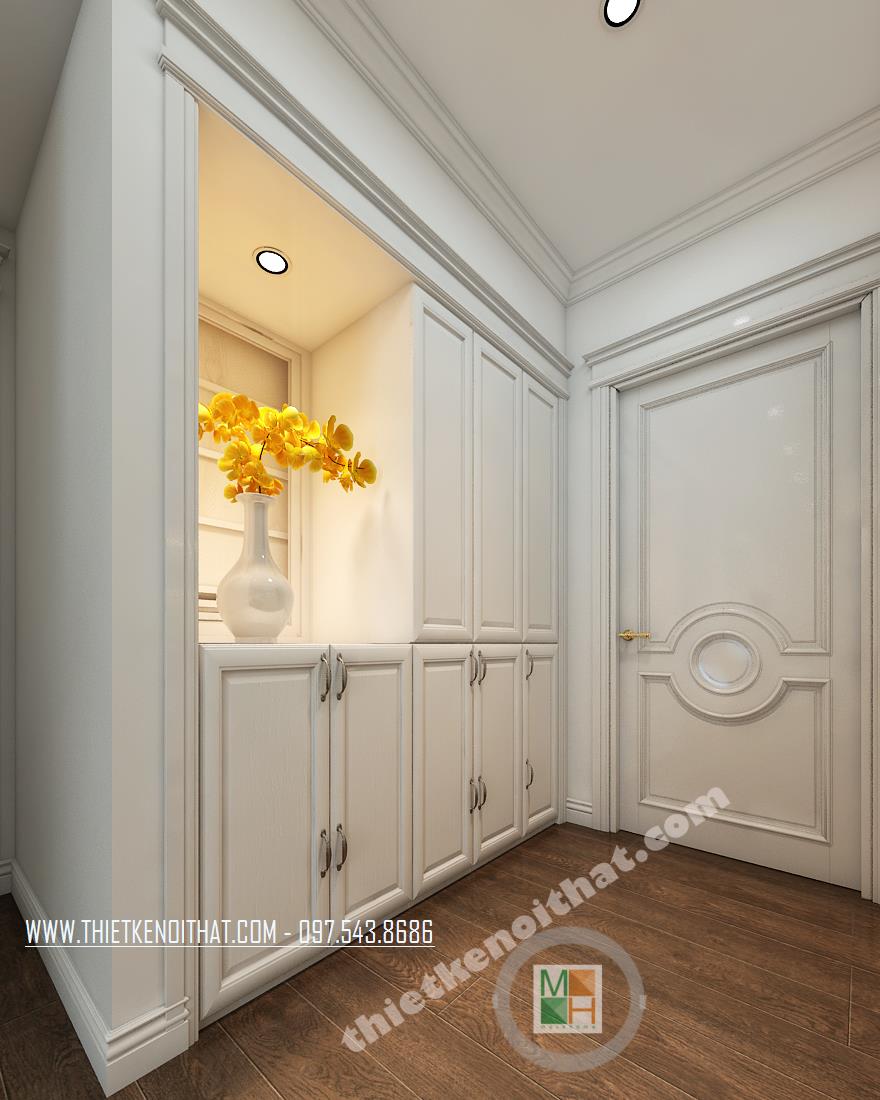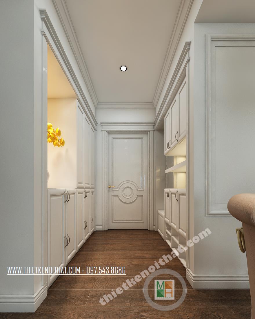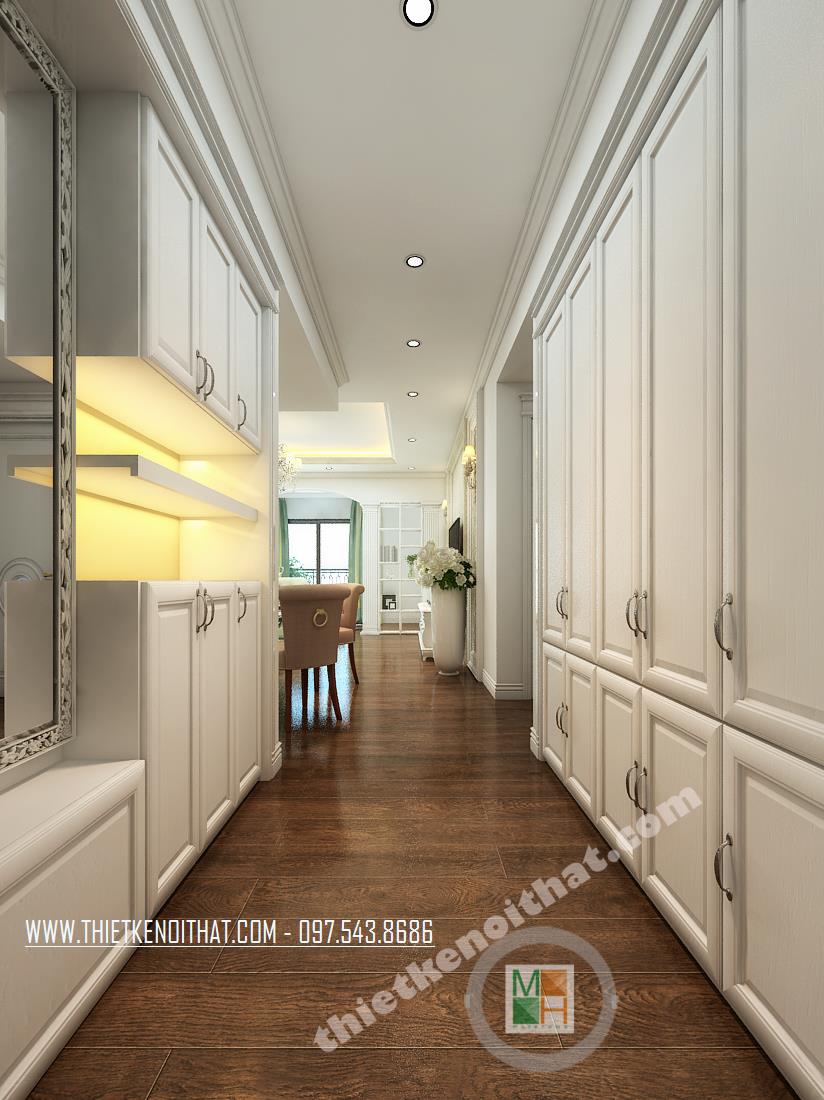Thiết kế nội thất không gian sinh hoạt chung cũng được tận dụng tối đa không gian. Các hệ tủ đứng, kệ trang trí, gương được sắp xếp 1 cách hợp lí dọc 2 bên hành lang đi lại vừa tiện dụng lại có thẩm mỹ cao cho không gian.