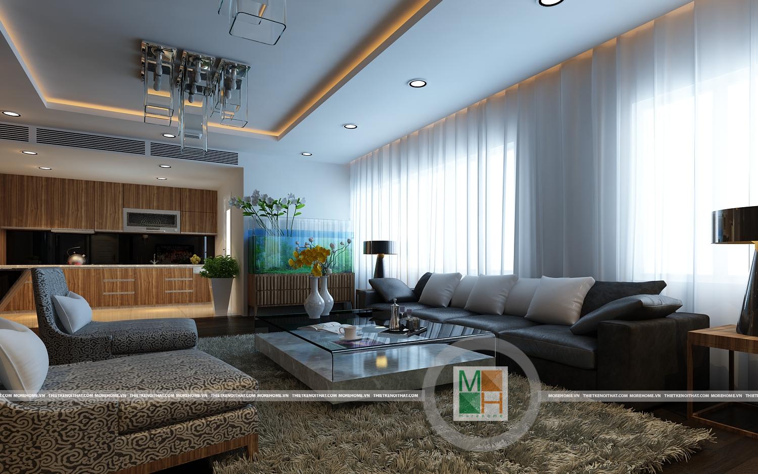 Thiết kế chung cư hiện đại mang đến cho gia chủ một không gian sống thân thiện, trẻ trung và gần gũi là yêu cầu mà kiến trúc sư Morehome nhận được khi bắt tay vào thiết kế căn chung cư này. Căn nhà với một diện tích hợp lý để thiết kế một căn chung với một phòng khách rộng, khu bếp và phòng ăn hiện đại, sang trọng, hai phòng ngủ với thiết kế tiện nghi và thoải mái.