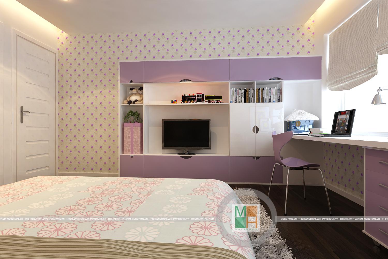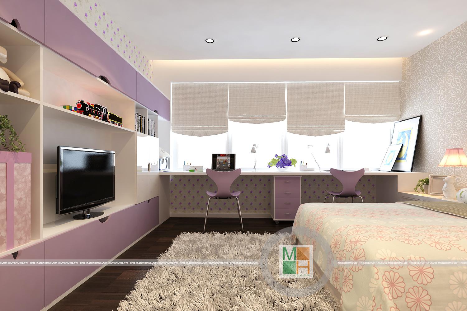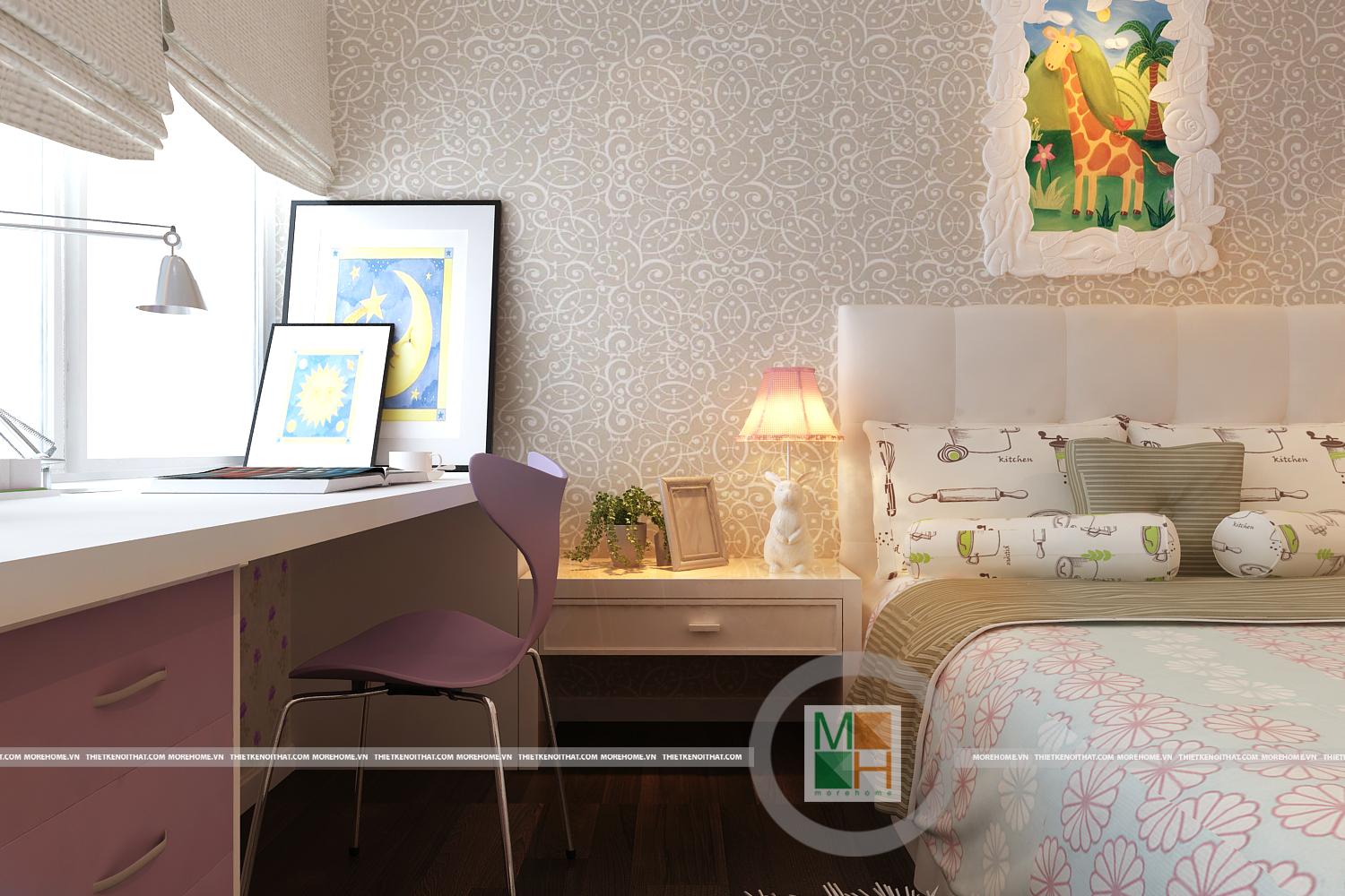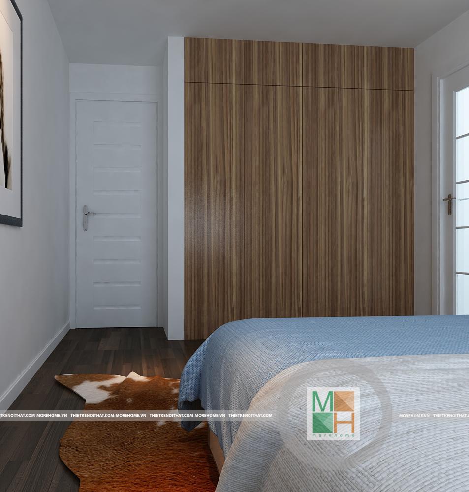 Thiết kế căn phòng ngủ thứ hai với sự kết hợp hài hòa các tông màu đơn sắc. Ánh sáng tự nhiên được sử dụng tối đa từ khung cửa sổ tạo độ thoáng cho căn phòng. Hệ thống tủ đựng đồ thiết kế hợp lý gần như đồng nhất với tường mang đến tiện nghi cho căn phòng và tiết kiệm tối đa diện tích sử dụng.