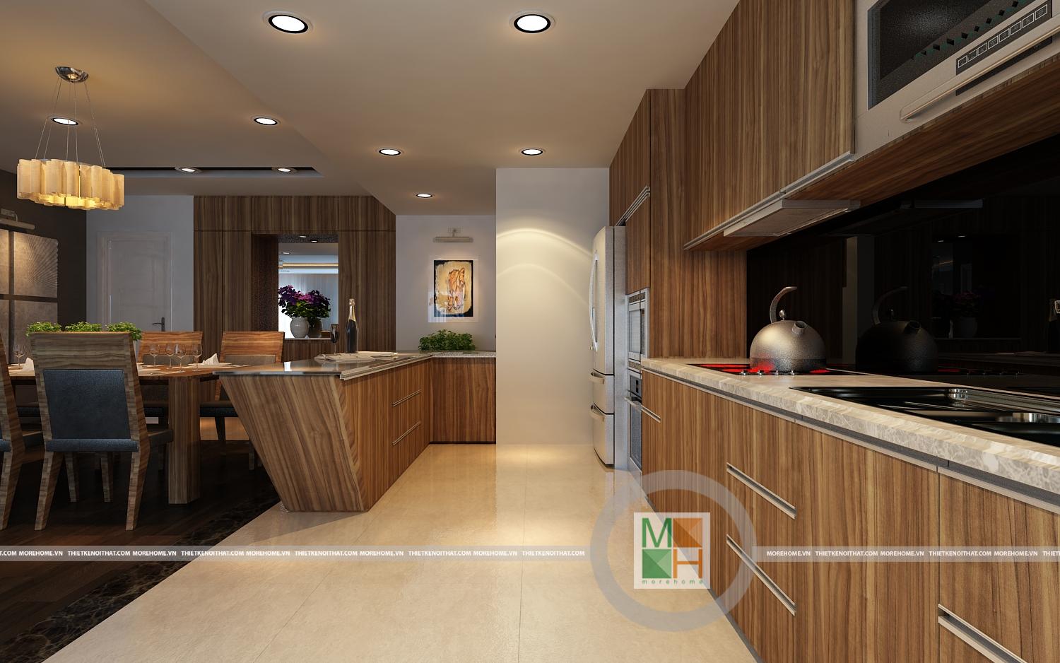 Thiết kế phòng bếp và bàn ăn liền kề với hệ thống tủ kệ veneer giả gỗ mang đến sự thân thiện và gần gũi. Các vật dụng trang trí được lựa chọn đều là những sản phẩm sáng tạo độc đáo mang đến sự hiện đại và tinh tế cho toàn bộ không gian sinh hoạt chung của cả gia đình.