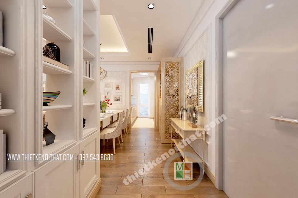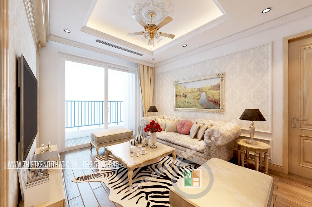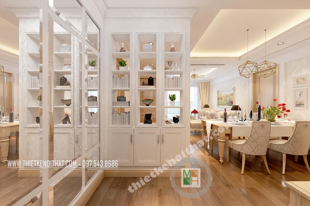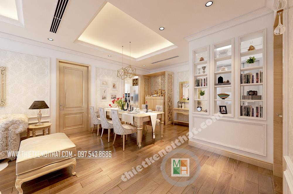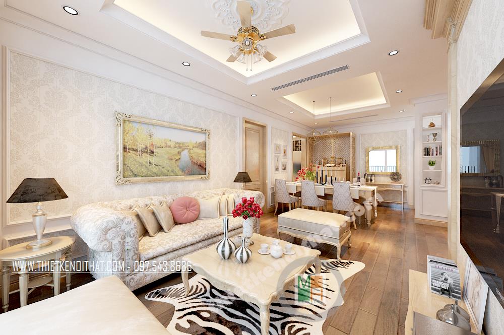 Màu sắc được sử dụng chủ yếu là tông màu kem sáng. Bước vào căn phòng khách bạn sẽ bị ấn tượng bởi các đường nét trang trí trên gần như tất cả các vật dụng trang trí. Không giống như thiết kế nội thất phong cách hiện đại, phong cách tân cổ điển thiên về sử dụng những đường cong và hoa văn cầu kỳ, tinh tế, từ đó mang đến cho gia chủ cảm giác trang nhã và sang trọng. Với điểm yếu về diện tích, kiến trúc sư đã khéo léo khắc phục bằng cách sử dụng khung gỗ trang trí đường viền tường tạo cảm giác kéo dài không gian, những kệ gỗ nhỏ thiết kế gần như đồng nhất với tường giúp tiện kiệm không gian và mang lại tiện ích cho gia chủ.