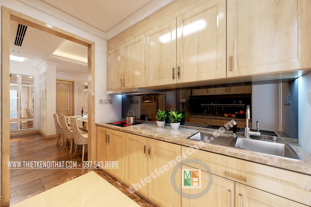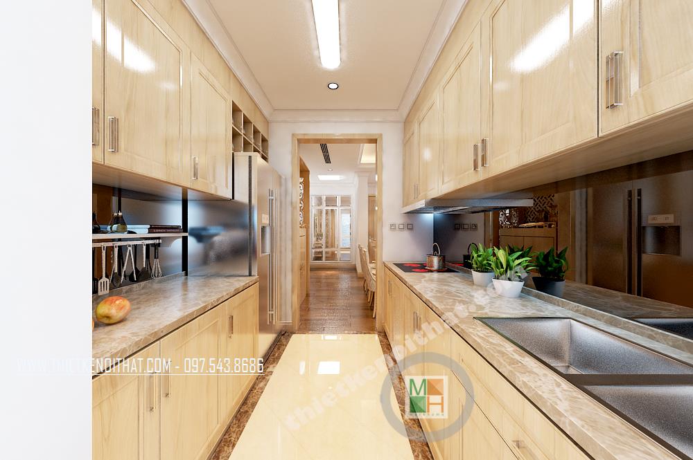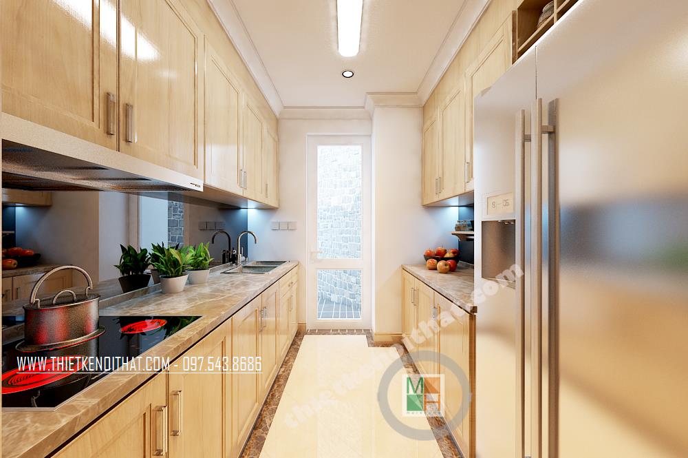 Với đặc điểm không gian hẹp và nhỏ, vì vậy thiết kế phòng bếp kéo dài với hệ thống tủ kệ hợp lý. Thiết kế này tạo cảm giác nhấn mạnh hơn về chiều dài của không gian từ đó tạo độ thoáng nhất định cho căn phòng.