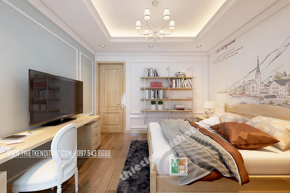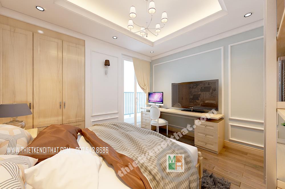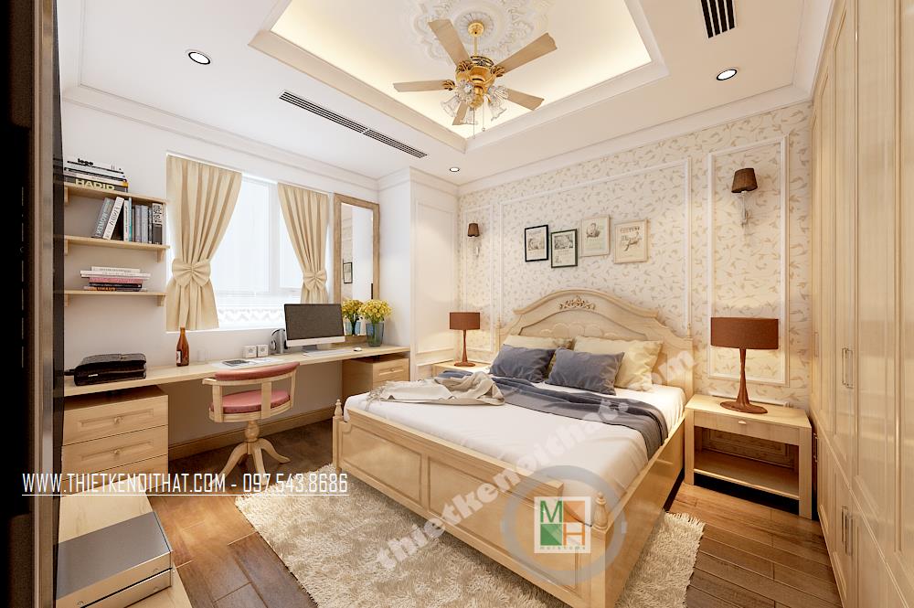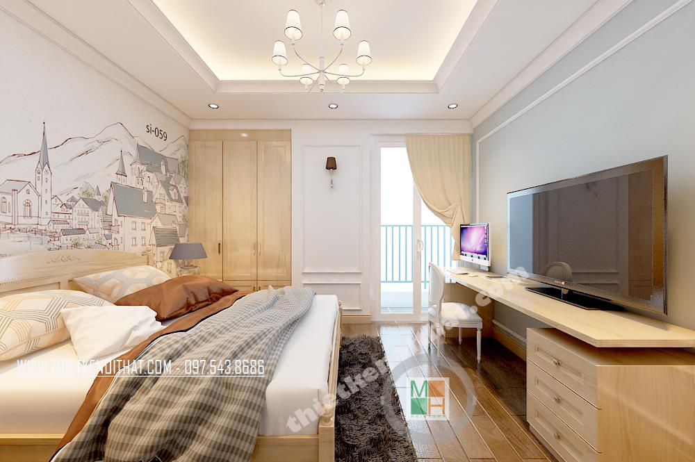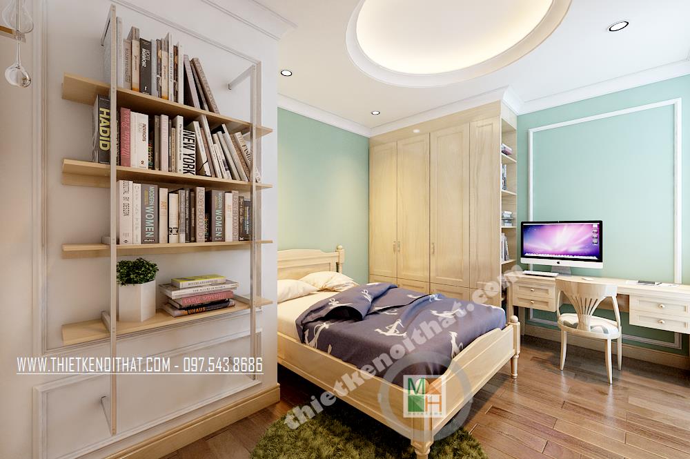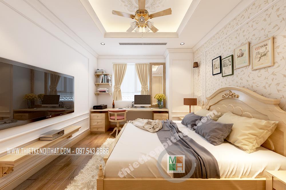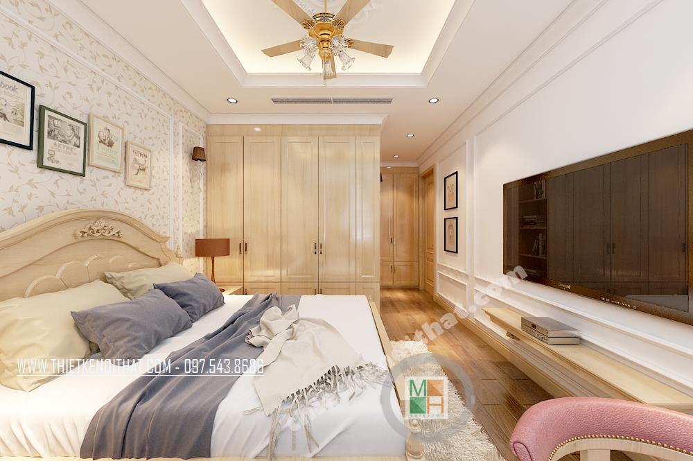 Thiết kế phòng ngủ phong cách cổ điển đơn giản với tông màu trắng làm chủ đạo. Một bên tường được sơn cách điệu bằng tông màu xanh nhẹ giúp không gian không còn đơn điệu và nhàm chán. Một vài điểm nhấn cách tân cổ điển được thể hiện tinh tế trên hoa văn trang trí của ghế tựa, giường, tủ…