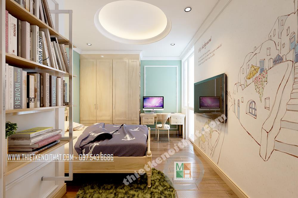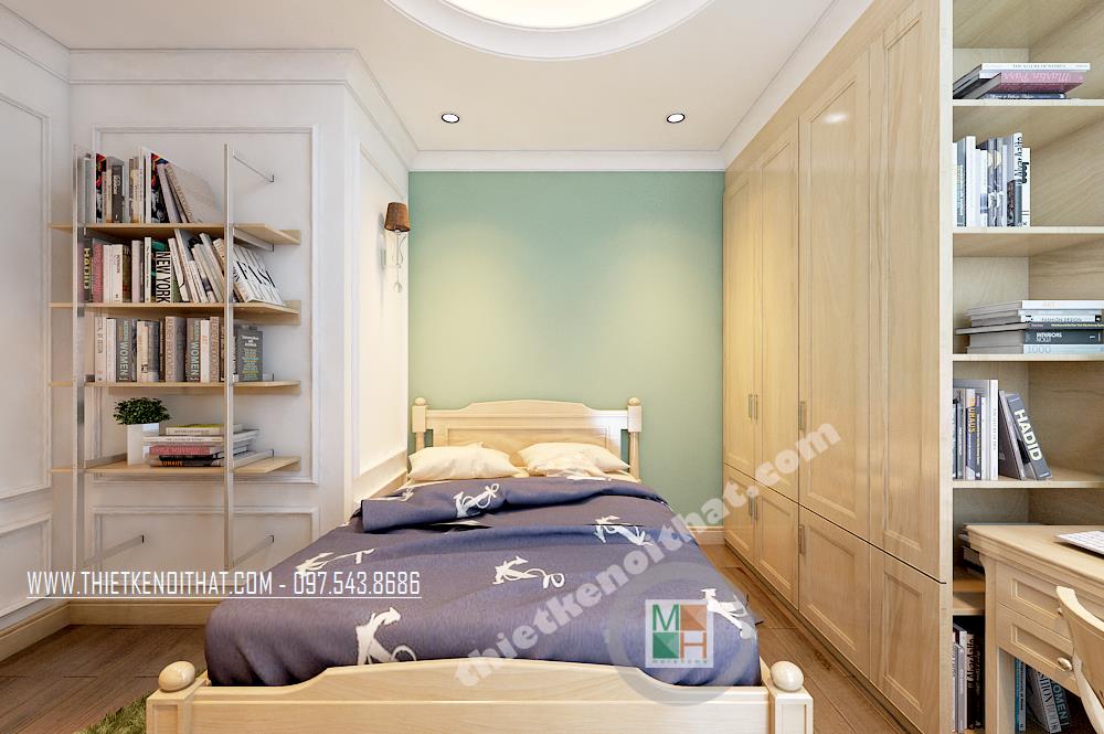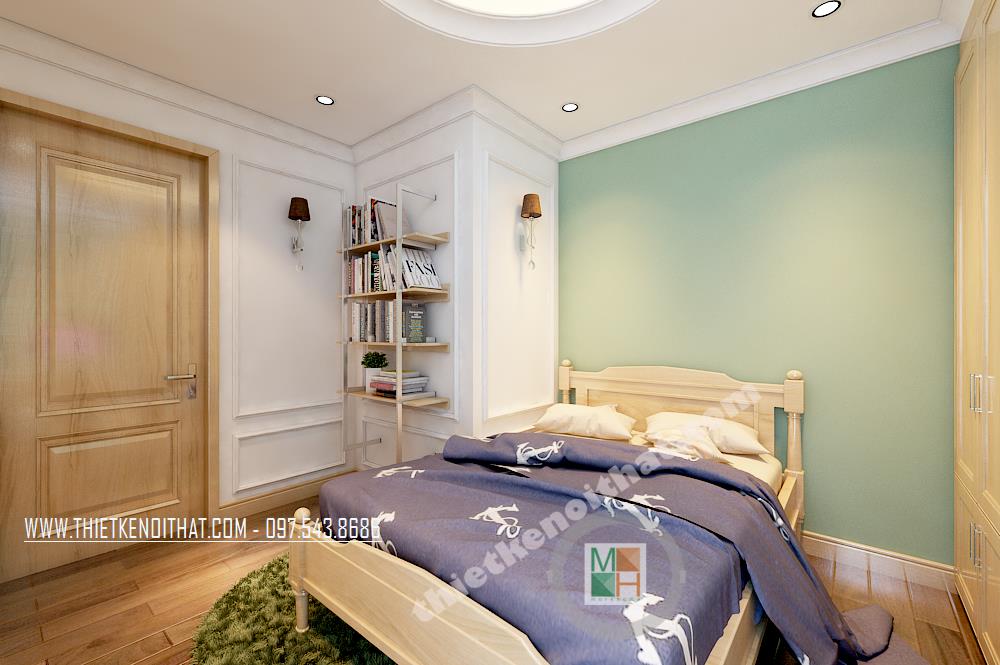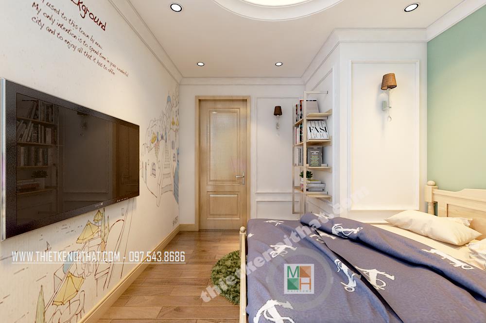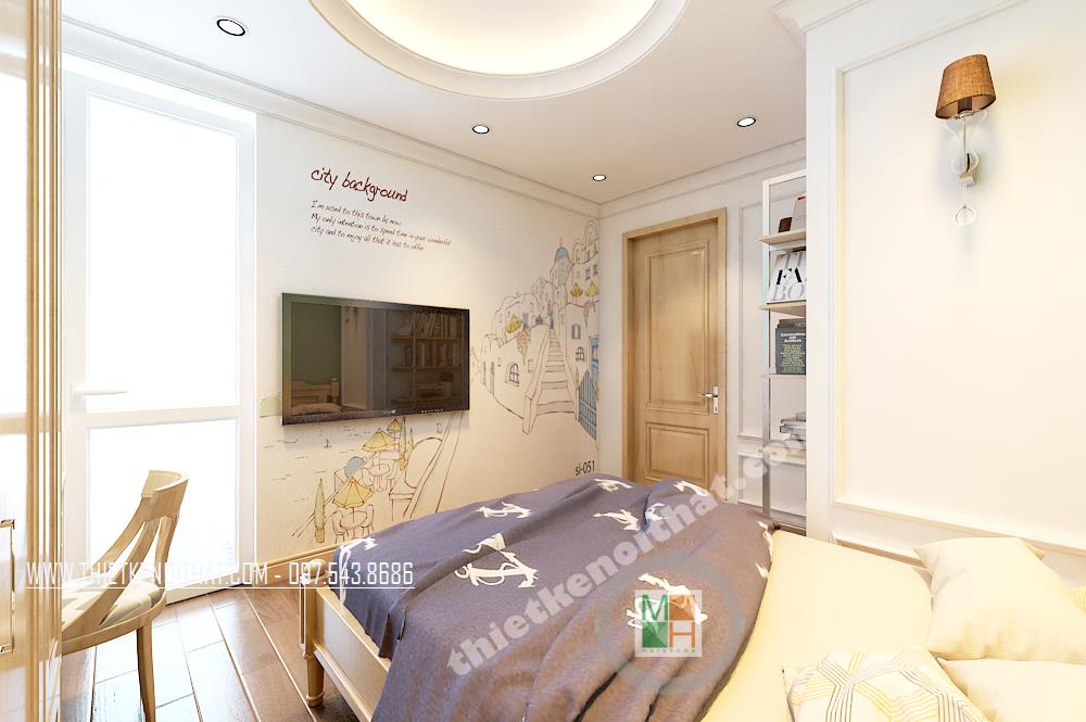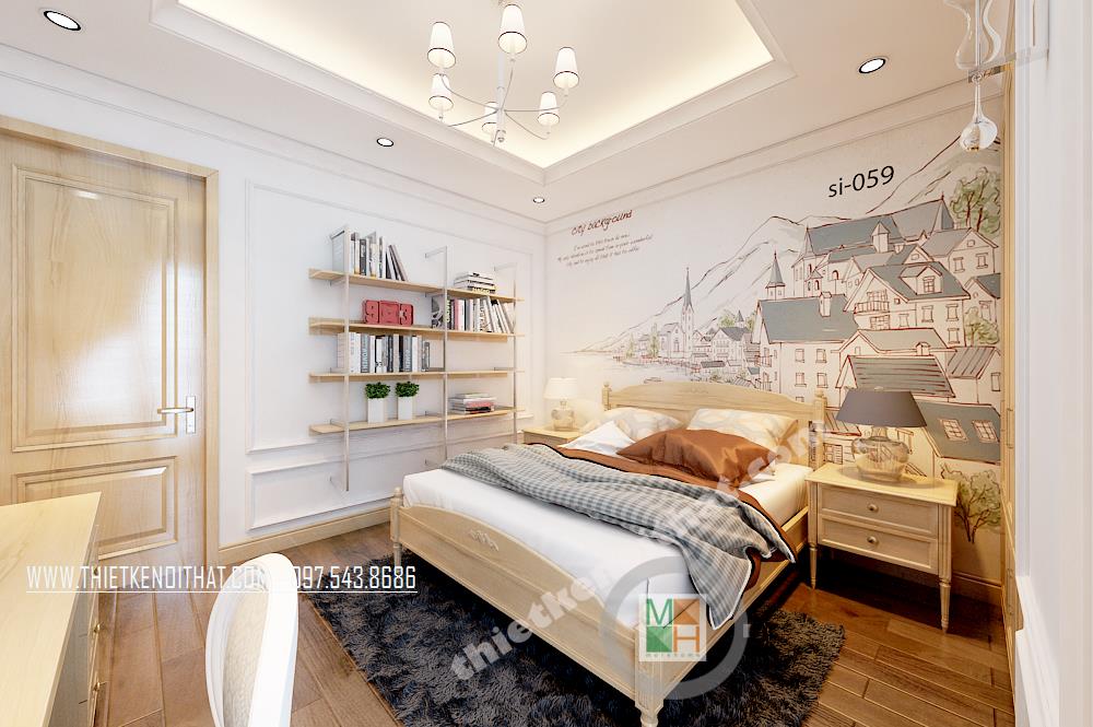 Thiết kế nội thất phòng ngủ thứ hai cũng khá đơn giản với hoa văn trang trí tinh nghịch và sáng tạo. Một góc phòng bị chia cắt đã được kiến trúc sư khéo léo thiết kế một giá sách treo tường vừa đảm bảo tính thẩm mỹ vừa mang lại tiện nghi sử dụng cho gia chủ.