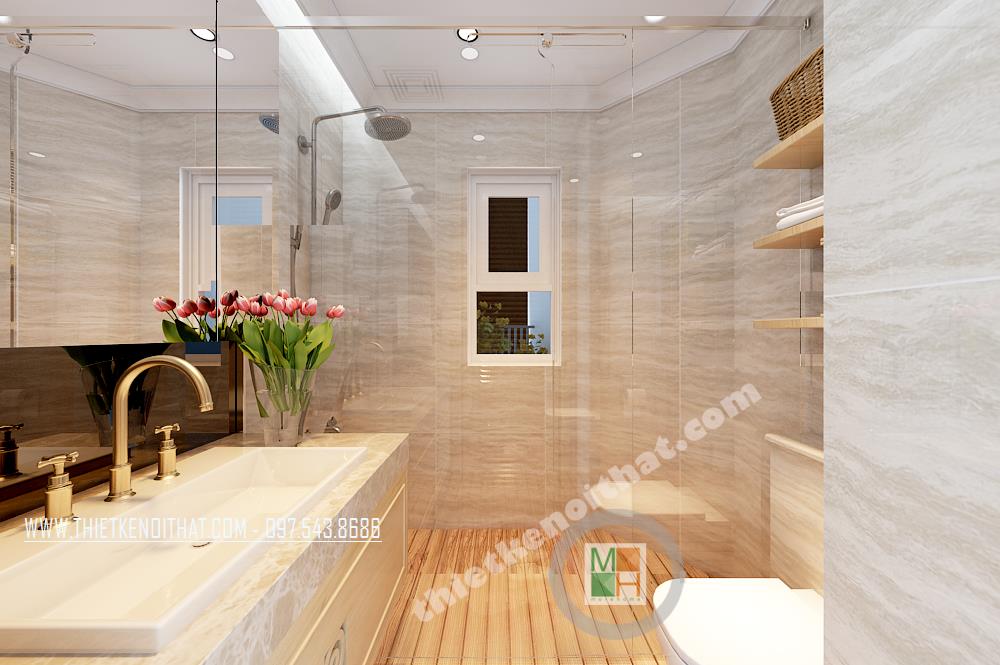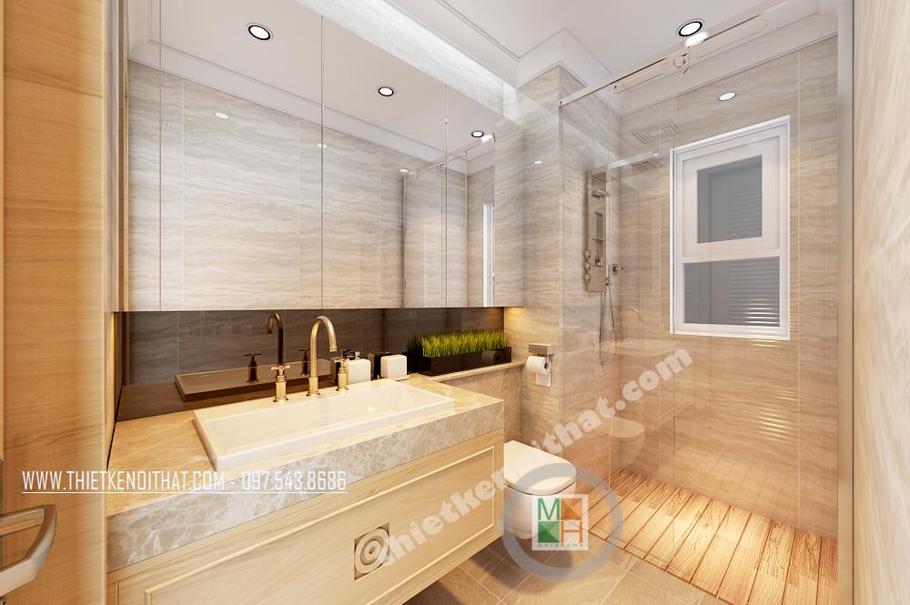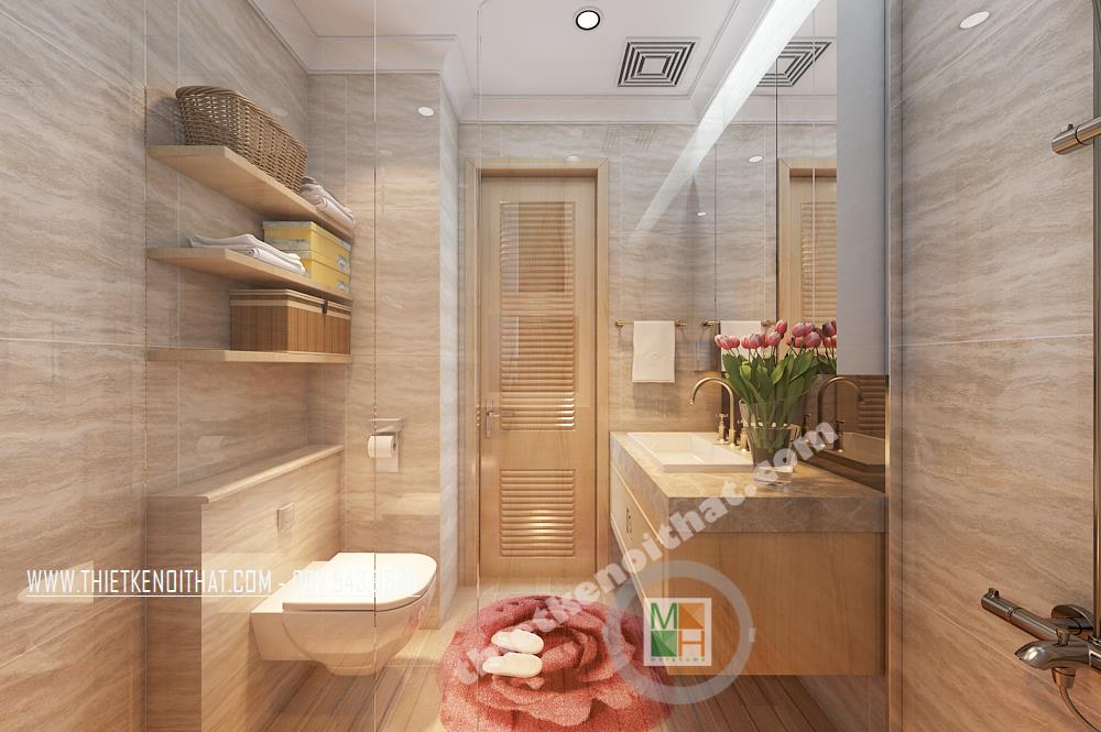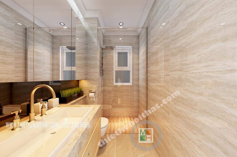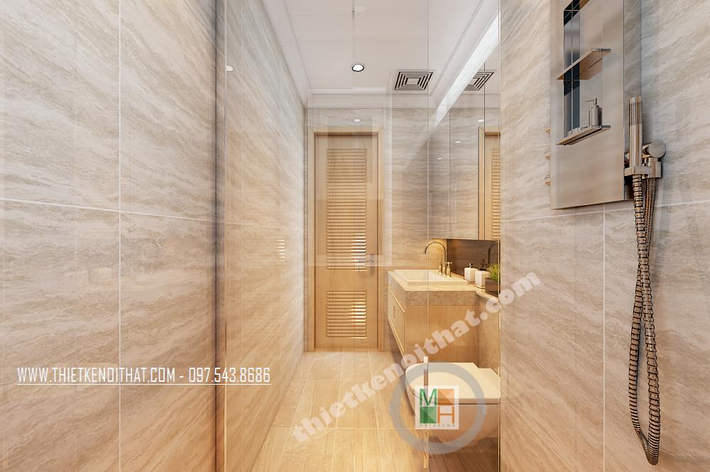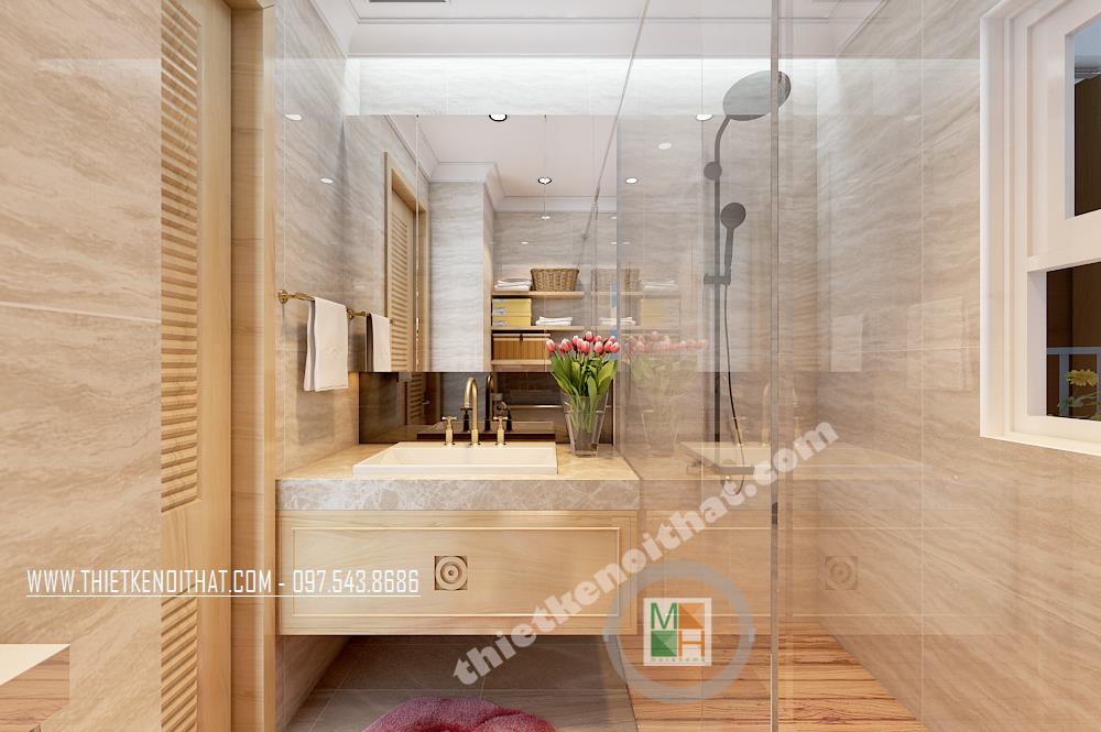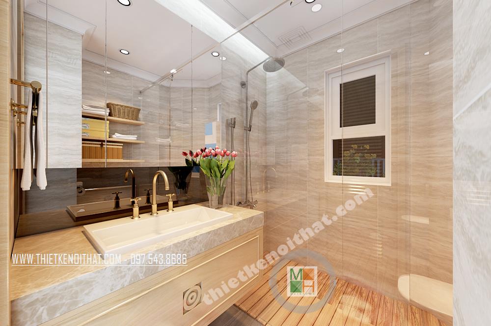 Thiết kế phòng tắm đơn giản và tiện dụng. Các vật liệu nhẹ như kính cường lực, kệ tủ được sử dụng làm tăng tính thẩm mỹ và tạo độ thoáng cho căn phòng. Hệ thống gương phản chiếu được sử dụng và bố chỉ hợp lý tạo hiệu ứng tương phản không gian mang lại cảm giác mở cho không gian phòng tắm nhỏ, hẹp.