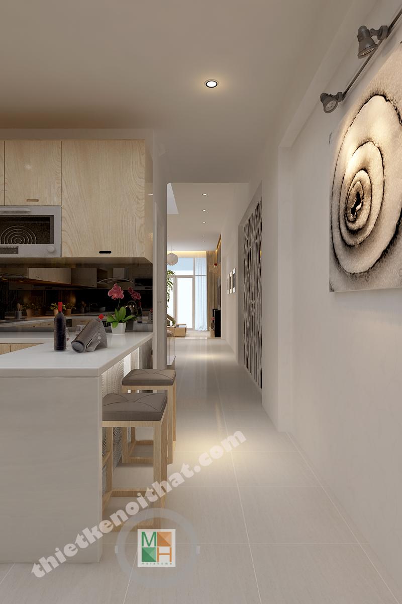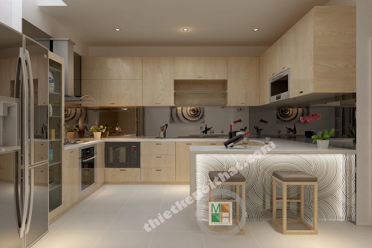 Căn bếp được trang bị hiện đại vơi đầy đủ các thiết bị nấu nướng như tủ lạnh, lò nướng và lò vi sóng. Hệ thống tủ bếp làm bằng gỗ sáng màu tạo cảm giác thân thiện khi sử dụng. Bàn soạn được kết hợp làm quầy bar, tạo ra một hệ tủ phía dưới rất tiện lợi. Mặt ngoài của bar được trang trí bằng những họa tiết đơn giản mà tinh tế.