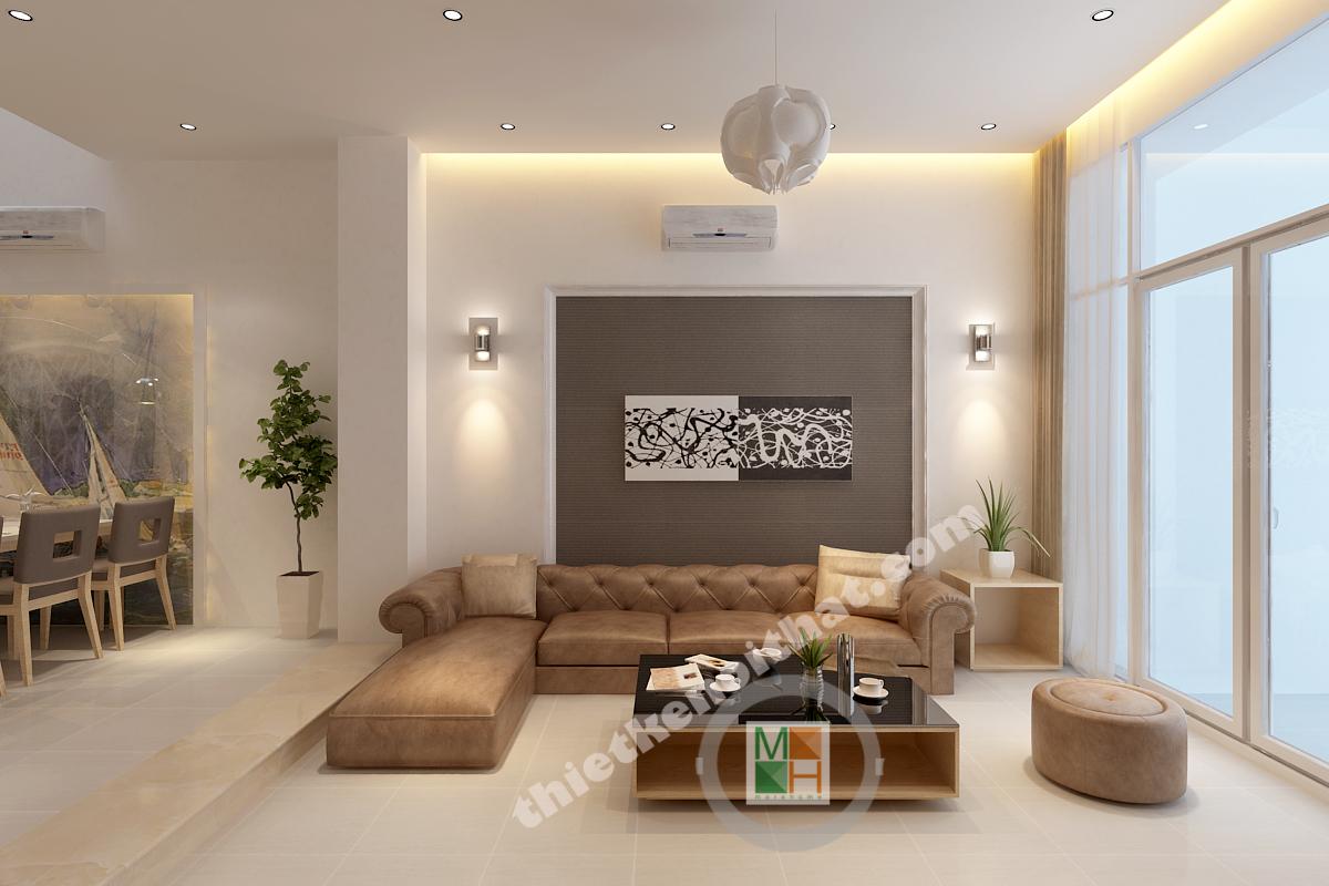 Màu sắc của nội thất phòng khách không sặc sỡ nhưng vẫn để lại được ấn tượng nhờ cách bài trí thông minh. Bộ sofa màu café và mảng tường ghi đằng sau tạo điểm nhấn và chiều sâu cho không gian. Bàn trà nhỏ gọn với mặt kính đen độc đáo. Có thể tô điểm thêm cho bức tường sofa dựa lưng thêm sống động bằng một bức tranh nghệ thuật nhẹ nhàng.