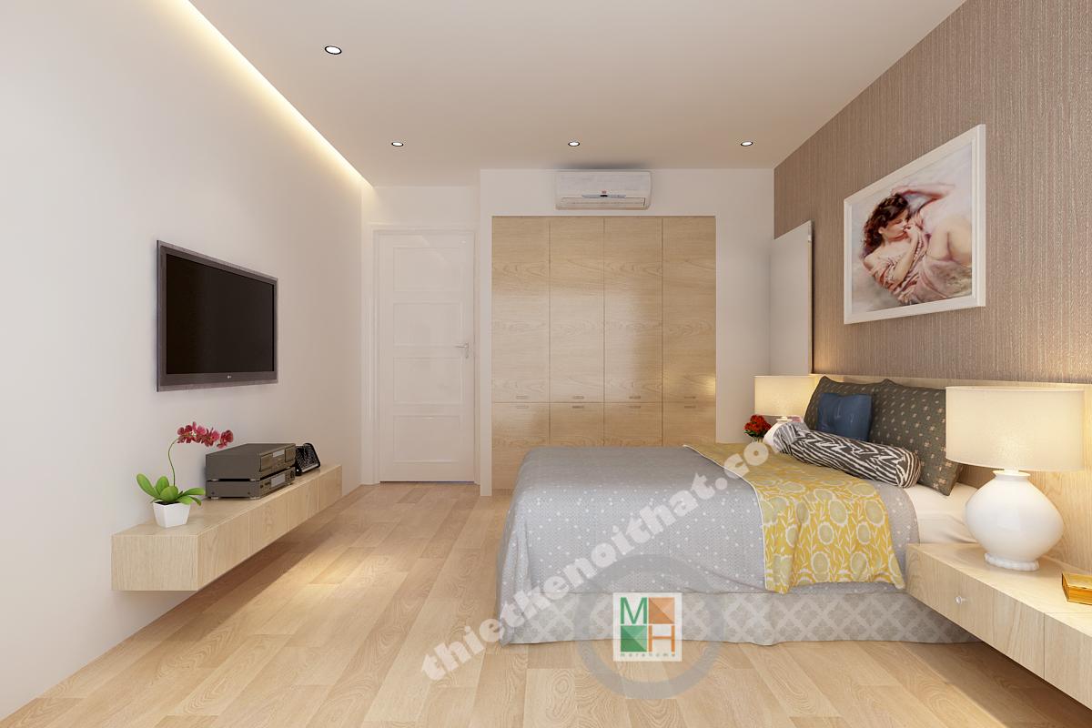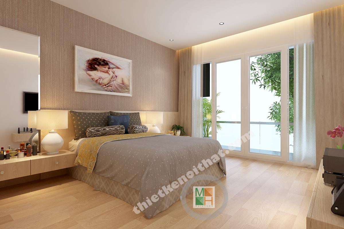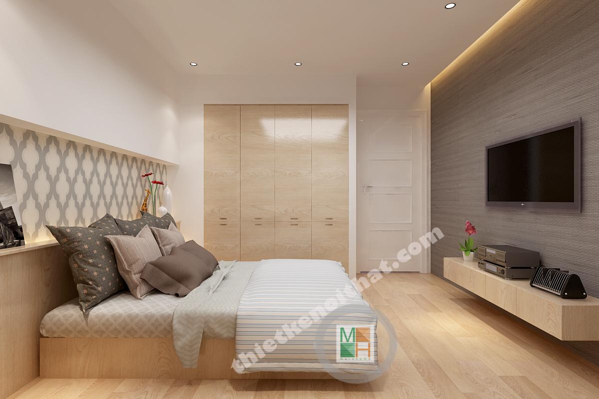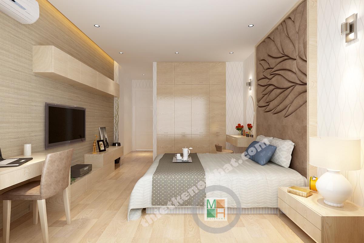Phòng ngủ master không có diện tích quá lớn nhưng vẫn đảm bảo được sự thông thoáng nhờ hệ thống cửa kính hướng ra ngoài loggia. Vật liệu gỗ được sử dụng nhiều trong trang trí nội thất nên khi kết hợp với ánh sáng sẽ tạo ra một không gian ấm áp, gần gũi. Điểm nhấn của căn phòng nằm ở mảng tường vải phía đầu giường. Mảng tường có những rãnh nhỏ phía trên tạo thành một bông hoa cỡ lớn rất lãng mạn, đặc biệt là với những đôi vợ chồng trẻ. Bàn trang điểm và táp được thiết kế ngay cạnh đầu giường, tạo ra sự liên kết chắc chắn và tiện lợi khi sử dụng. Hệ thống tủ quần áo được thiết kế âm tường gọn gàng, tạo ra thêm nhiều không gian lưu trữ đồ.