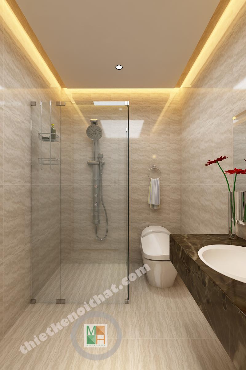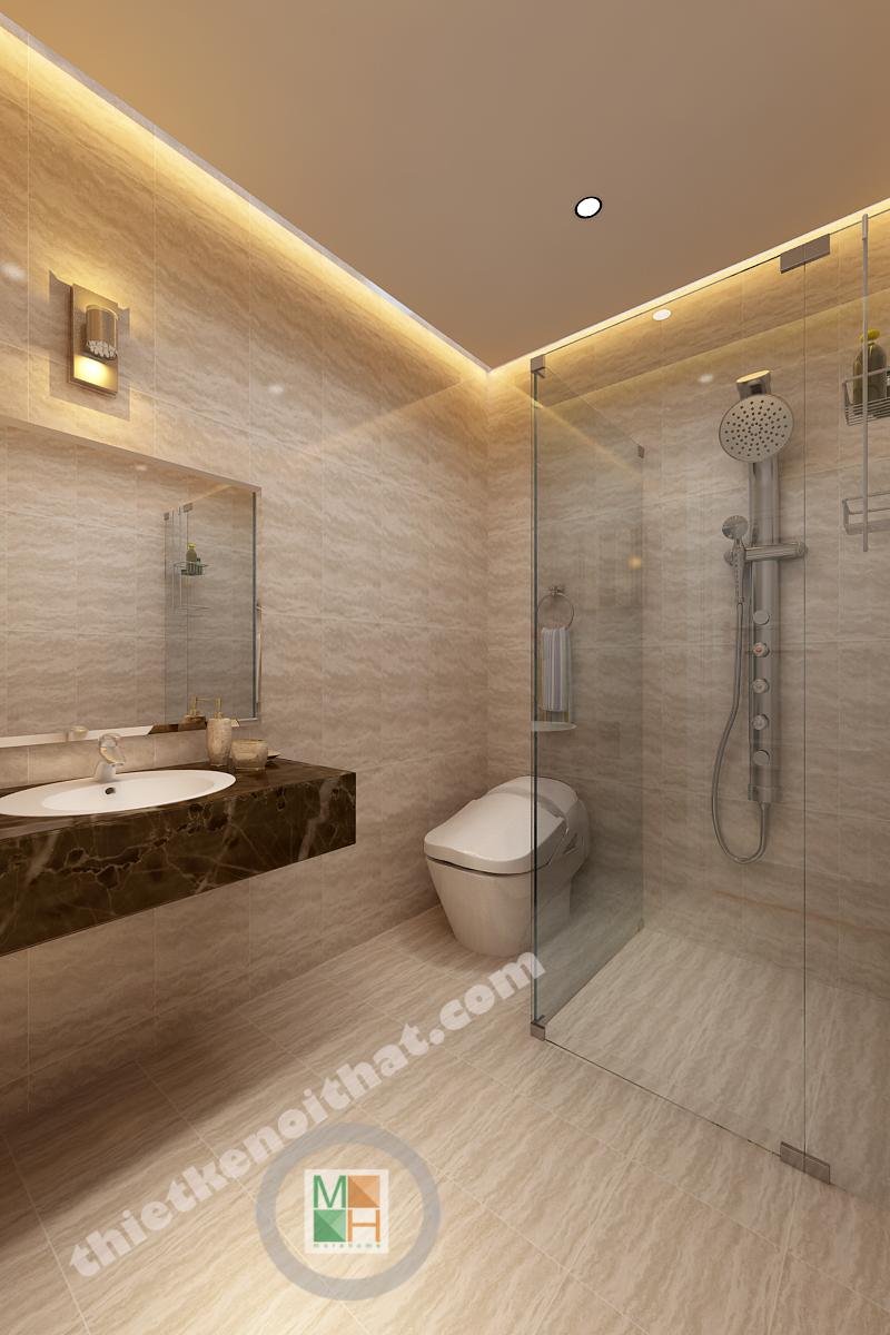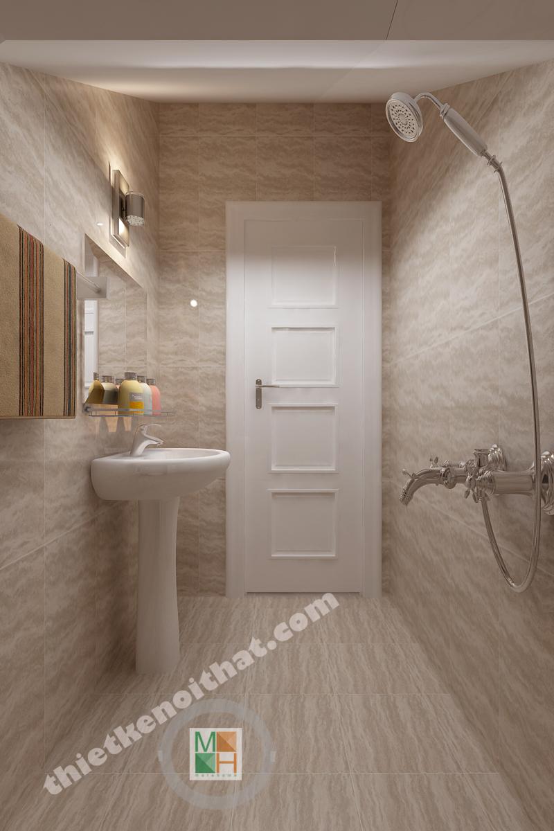 Phòng tắm ở lầu một và lầu hai có diện tích bằng nhau và đều sử dụng đá lát sáng màu nhằm tạo cảm giác sạch sẽ. Phòng tắm ở lầu hai được đầu tư hơn với bồn tắm đứng có kính ngăn trong suốt. Mảng kính này không những ngăn nước bắn mà còn khiến không gian trông tinh tế hơn.