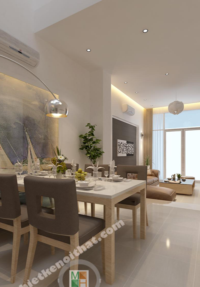 Bàn ăn được đặt ngay cạnh phòng khách nhằm tạo ra sự liên kết trong sinh hoạt. Bộ bàn ghế này cũng là gỗ giống như kệ tivi nhằm tạo ra sự thống nhất trong chất liệu. Vì phía trên bàn ăn không có trần nên đèn thả được thiết kế giống như những chiếc cột điện, vừa đảm bảo đủ ánh sáng mà cũng là một kiểu trang trí mới lạ. Mảng tường sát với bàn ăn có lắp một bức tranh kính để tạo không khí vui vẻ và giúp nhân đôi ánh sáng cho khu vực này. Hành lang dẫn từ bàn ăn vào bếp có bố trí dãy đèn downlight để khiến không gian sáng hơn và không có cảm giác gò bó.