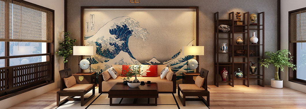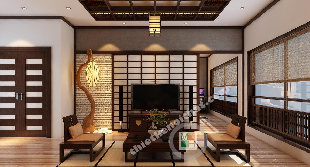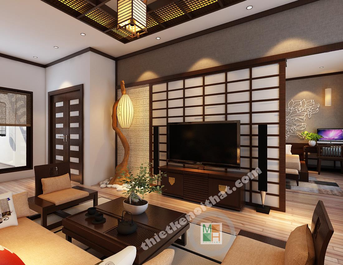 Phòng khách của căn hộ sử dụng đan xen cặp màu trắng - nâu, tạo sự tương phản để giúp ta cả nhận được những điểm nhấn từ các chi tiết kiến trúc hay đồ trang trí. Bộ bàn ghế tiếp khách được làm bằng gỗ có kiểu dáng khá thấp thể hiện phong cách thiết kế tối giản. Các đồ nội thất và trang trí khác trong phòng cũng sử dụng gỗ làm chất liệu chính như kệ tivi, khung tranh, kệ đồ... Sở dĩ có nhiều đồ gỗ như vậy là do kiến trúc Nhật Bản là sự giao hòa giữa môi trường thiên nhiên với con người. Góc phòng cũng có một chậu cây cảnh để thể hiện sự hòa hợp, tôn trọng tự nhiên, đồng hành với thiên nhiên trong hành trình sống của đời người. Bức tranh sóng nước ở mảng tường phía sau tạo điểm nhấn cho gian phòng và cũng rất hợp phong thủy. Tấm thảm kê ở giữa phòng mô phỏng theo những tấm đệm cói dùng để ngồi uống trà của người Nhật, gọi là "Tatami".