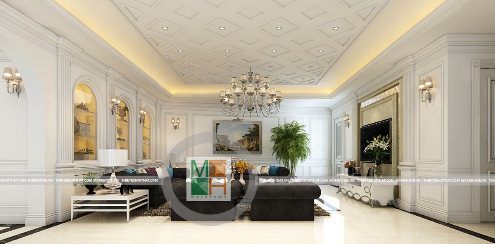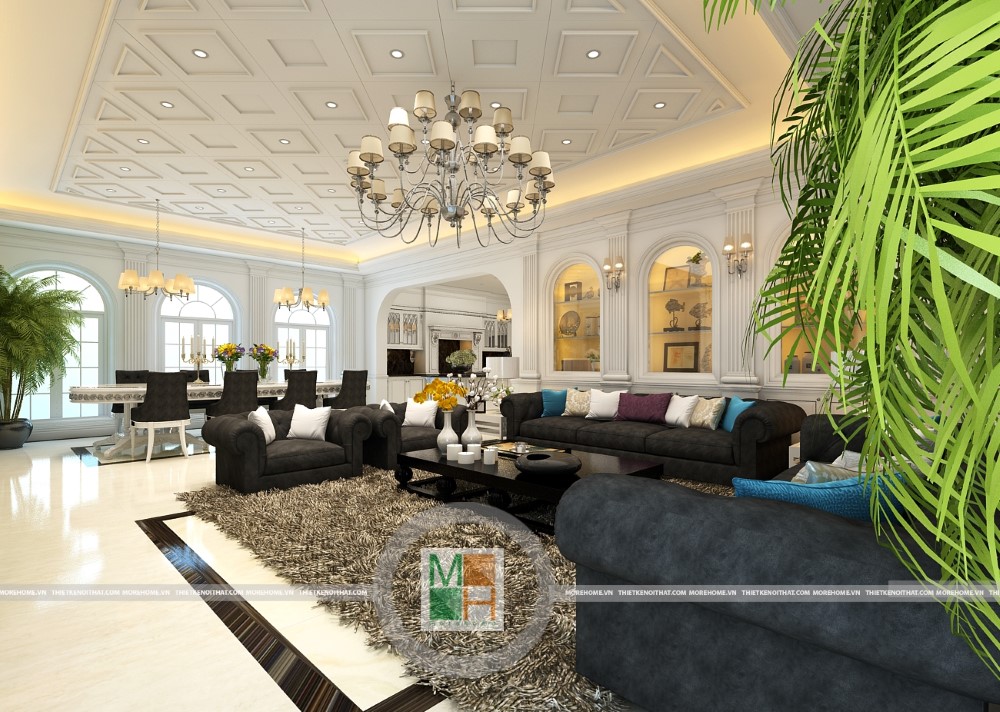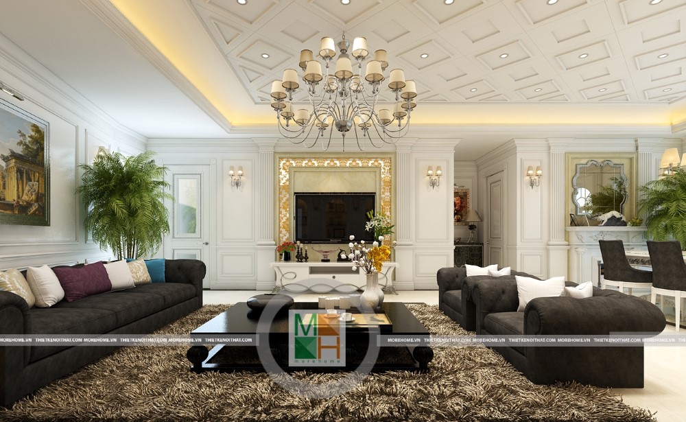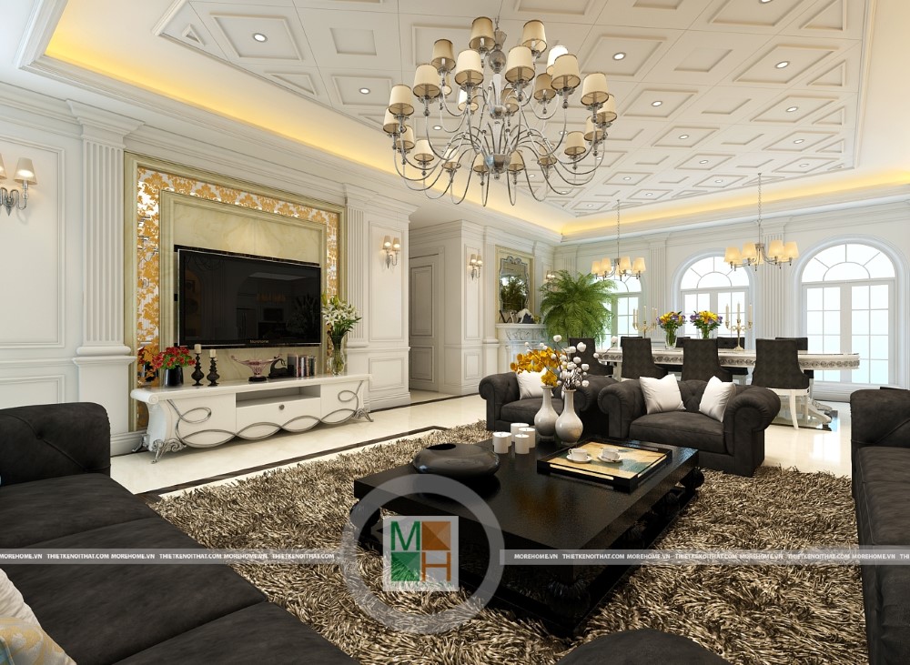 Phòng khách với thiết kế mở rộng, hệ thống đèn được bố trí đối xứng có chủ ý tạo một không gian sang trọng và thu hút. Bộ sofa theo tông màu tối trầm với các chi tiết trang trí điểm xuyết màu sắc từ những chiếc gối tạo sự hài hòa và ăn nhập với phong cách mà các kiến trúc sư thiết kế nội thất đang hướng tới. Đặc biệt không gian kiến trúc xanh cũng được tác giả chú trọng khi tạo điểm nhấn là chậu cây cảnh trong phòng khách. Một điểm đặc biệt không thể bỏ qua ở đây chính là nơi đặt tivi, với thiết kế bắt mắt, đường nét trang trí mang đậm tính cổ điển và quý phái.