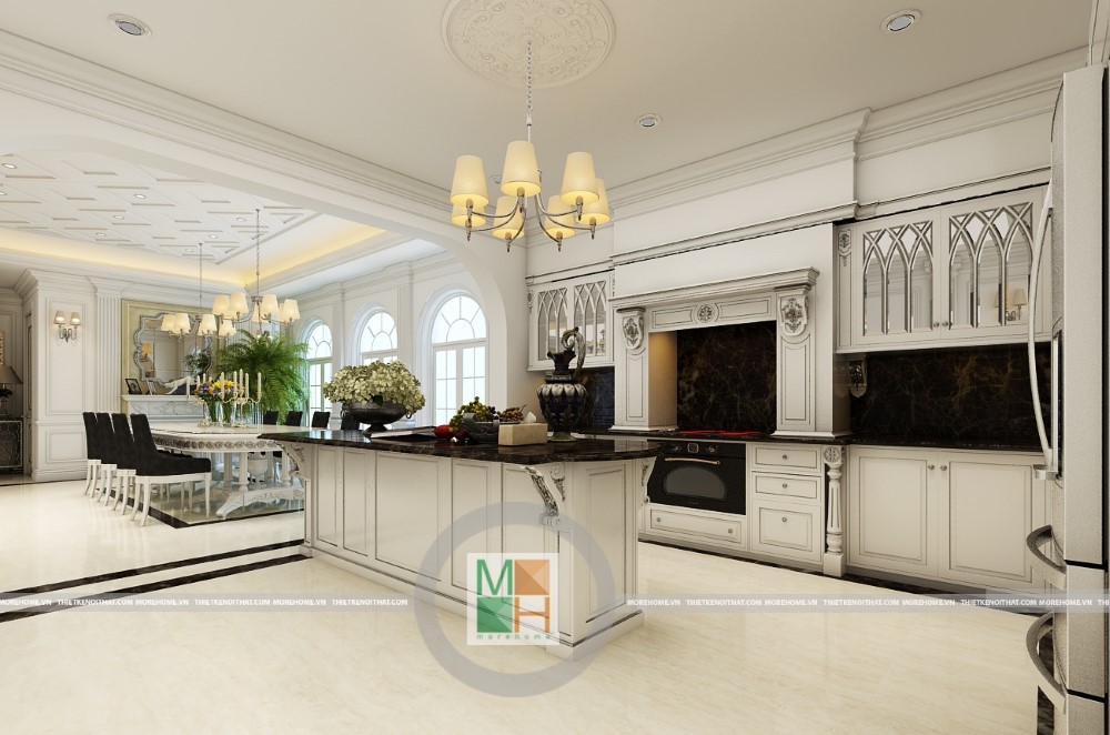 Bên cạnh không gian phòng ăn chính là khu nhà bếp. Với việc tận dụng tối đa không gian trong thiết kế nội thất, các kiến trúc sư đã khéo léo bố trí các tủ bếp ngăn nắp, mở rộng không gian sinh hoạt và tạo độ thoáng cho căn phòng. Tông màu được sử dụng chủ yếu trong thiết kế nội thất bếp là tông màu trắng, đồng nhất với phong cách thiết kế tân cổ điển đang hướng tới.