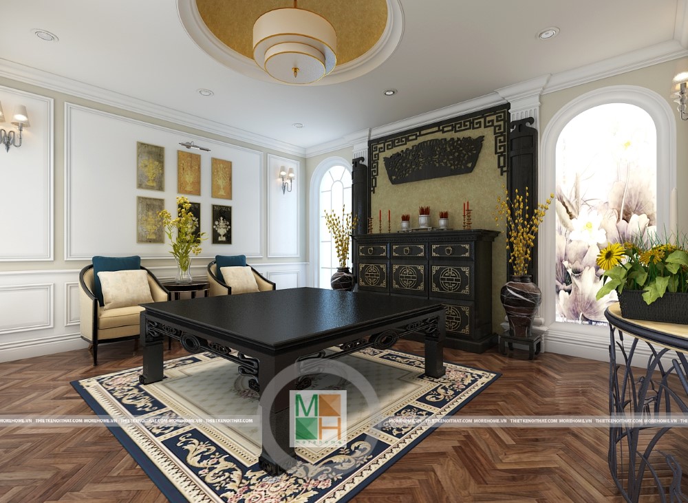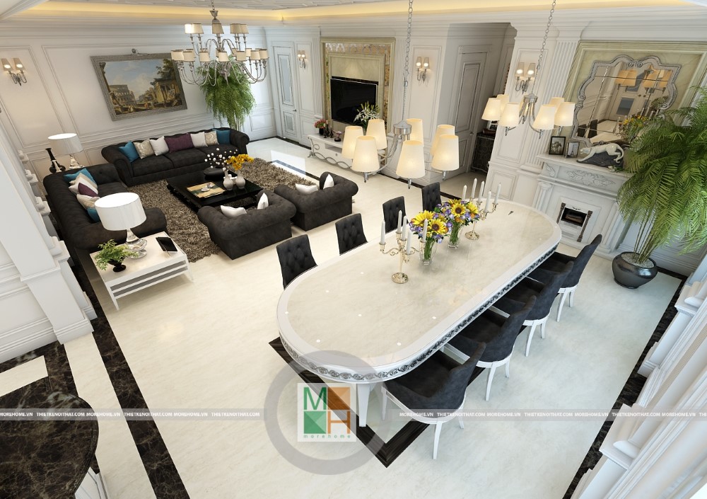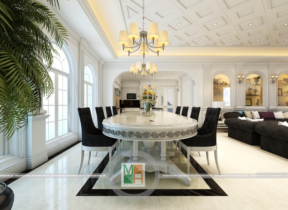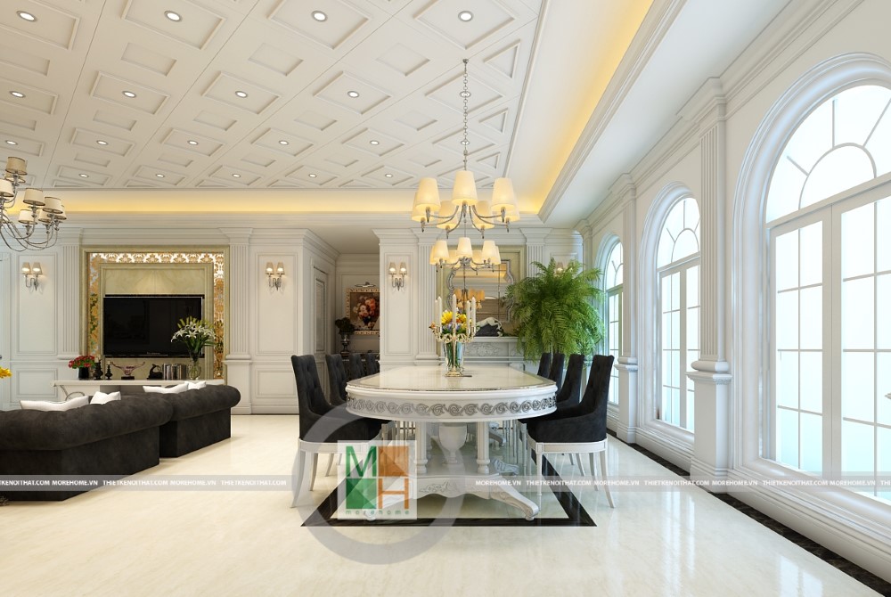 Phòng ăn được sắp xếp ngay gần phòng khách, không hề có vách ngăn cách. Bộ bàn ăn trang trọng cùng tông màu với bộ ghế sofa tạo cảm giác gần gũi và đồng bộ cho gia chủ. Trải khắp từ phòng khách đến phòng ăn chúng ta còn bắt gặp nhiều vật dụng trang trí ấn tượng mang nét đẹp của phong cách thiết kế nội thất tân cổ điển như những bức tranh, lọ hoa, hoa văn trang trí trên bàn ăn, đèn chùm… Ánh sáng cũng được các kiến trúc sư thiết kế nội thất vô cùng chú trọng. Hệ thống cửa sổ được mở rộng đón ánh sáng tự nhiên và tạo độ mở cho không gian.