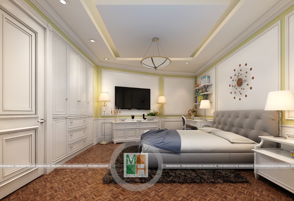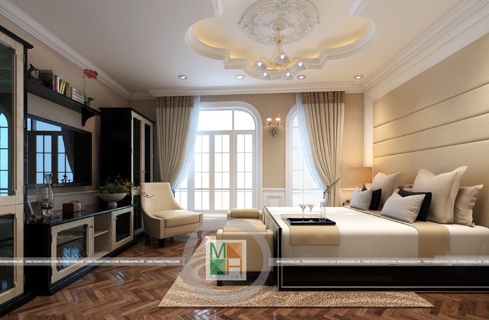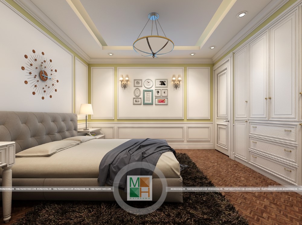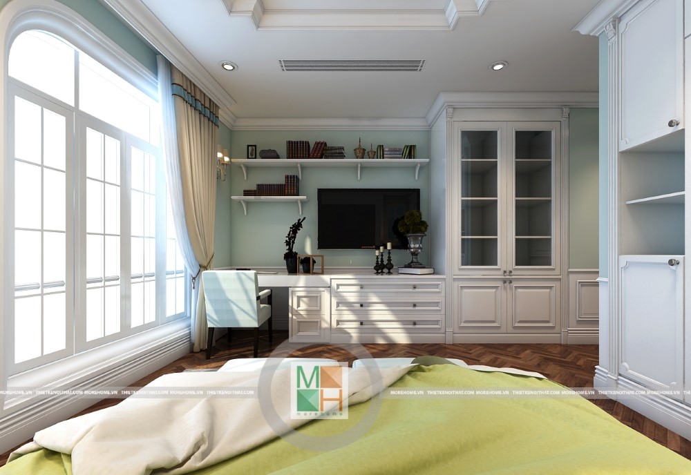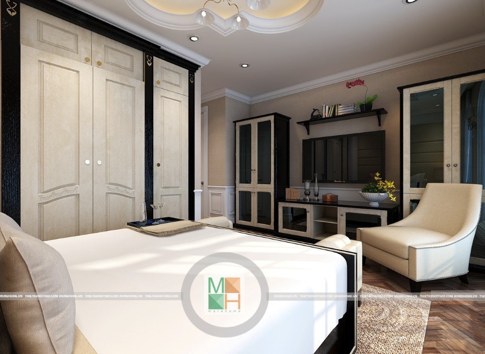Phòng ngủ thứ ba có được thiết kế với hệ thống tủ khá nhiều, tuy vậy nhưng không hề mang đến cảm giác gò bó và hẹp về không gian thiết kế. Một bức tường được các kiến trúc sư thiết kế nội thất cách tân và sử dụng làm cửa sổ đón ánh sáng tự nhiên từ bên ngoài. Các vật dụng trang trí khác như nến, đèn ngủ, các nét trang trí nhẹ nhàng trên tủ hay thảm, rèm cũng góp phần định hình phong cách thiết kế nội thất tân cổ điển cho cả căn nhà.