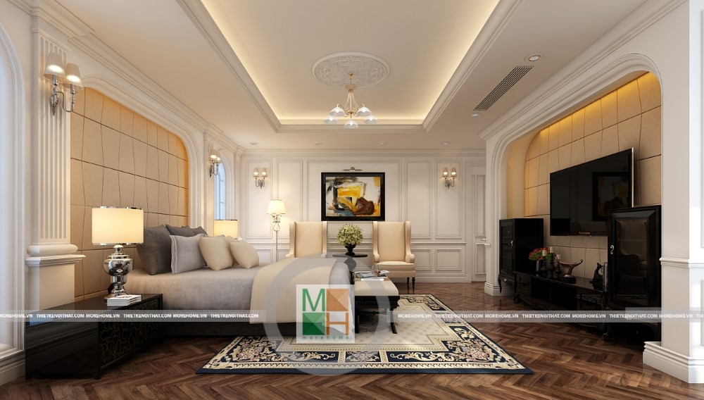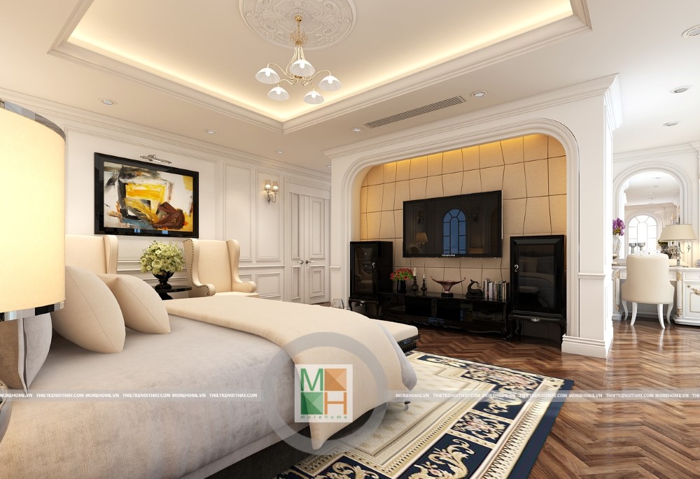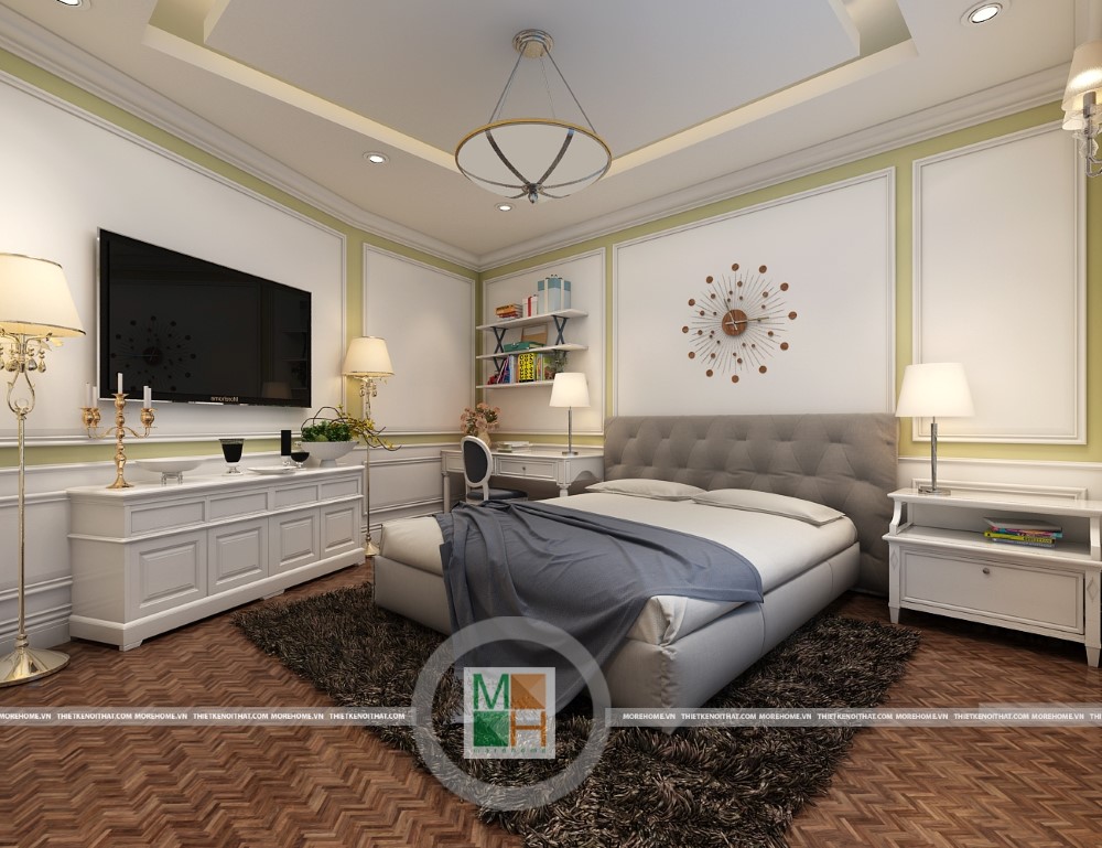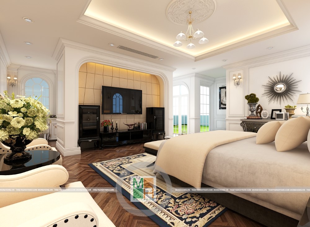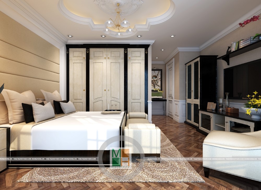 Phòng ngủ thứ ba có được thiết kế với hệ thống tủ khá nhiều, tuy vậy nhưng không hề mang đến cảm giác gò bó và hẹp về không gian thiết kế. Một bức tường được các kiến trúc sư thiết kế nội thất cách tân và sử dụng làm cửa sổ đón ánh sáng tự nhiên từ bên ngoài. Các vật dụng trang trí khác như nến, đèn ngủ, các nét trang trí nhẹ nhàng trên tủ hay thảm, rèm cũng góp phần định hình phong cách thiết kế nội thất tân cổ điển cho cả căn nhà.