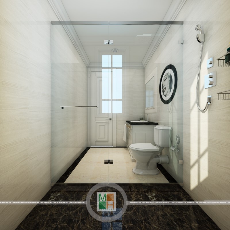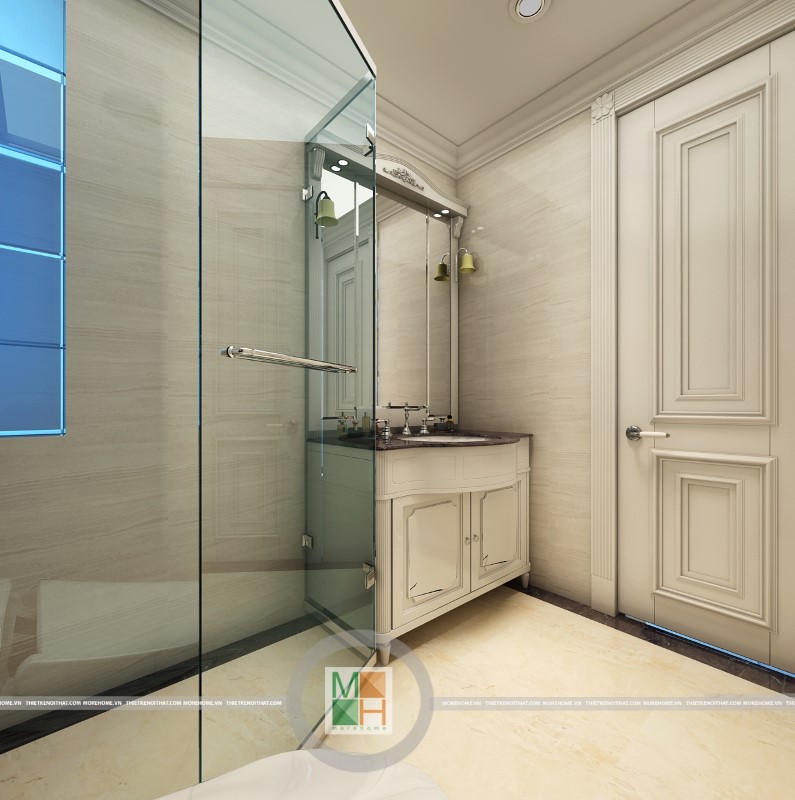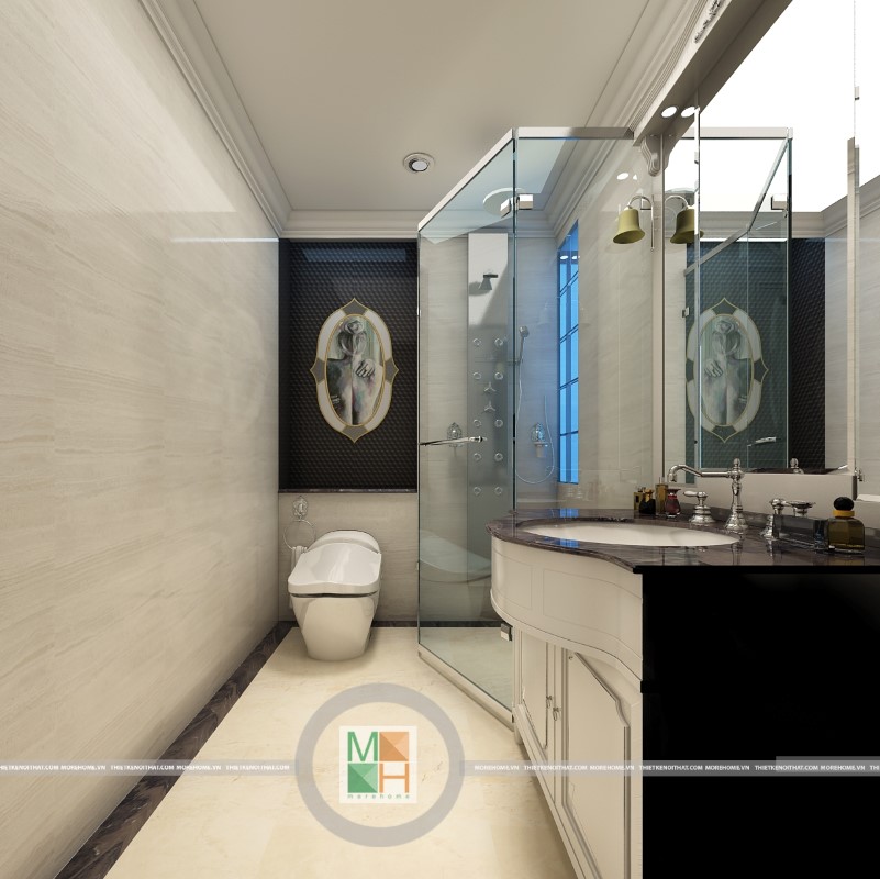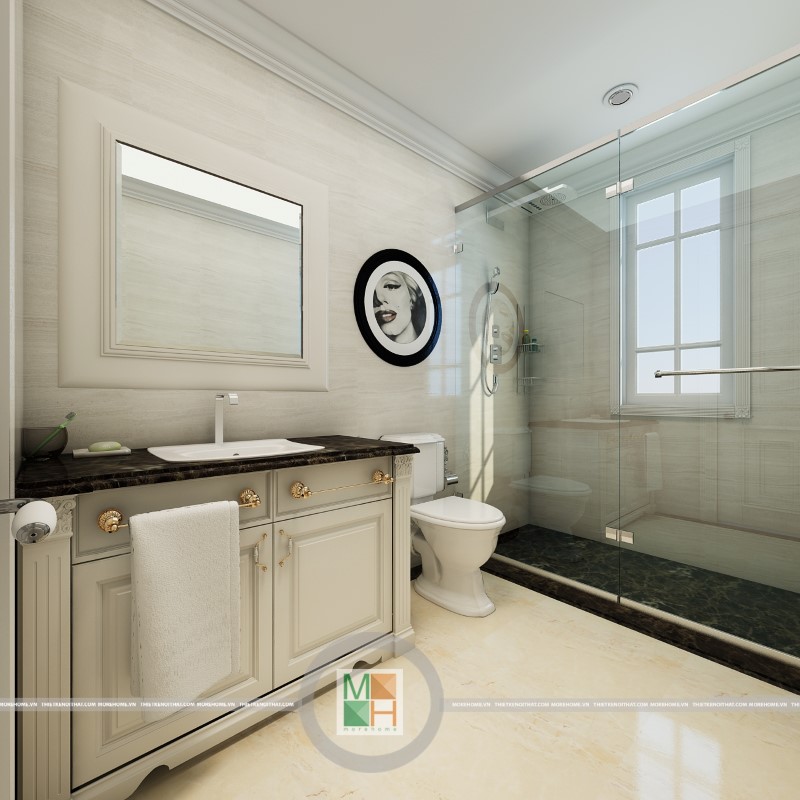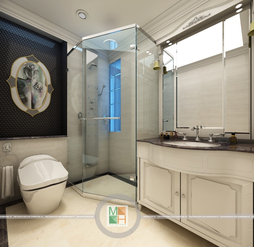 Phòng tắm là nơi mà có lẽ sẽ đem đến ấn tượng sâu sắc nhất trong tổng thể cả căn nhà. Ánh sáng tự nhiên được tận dụng tối đa từ hệ thống cửa sổ trải dài. Các thiết kế nội thất khác với phong cách tân cổ điển thực sự gây ấn tượng mạnh mang lại cảm giác sang trọng và tiện nghi cho gia chủ. Không gian xanh cũng được các kiến trúc sư thiết kế nội thất vô cùng chú trọng với việc sắp đặt có chủ ý các lọ hoa, cây xanh trong phòng. Các chi tiết khác như gạch lát sàn, hoa văn trang trí trên tường cũng góp phần lớn định hình phong cách tân cổ điển cho căn phòng.