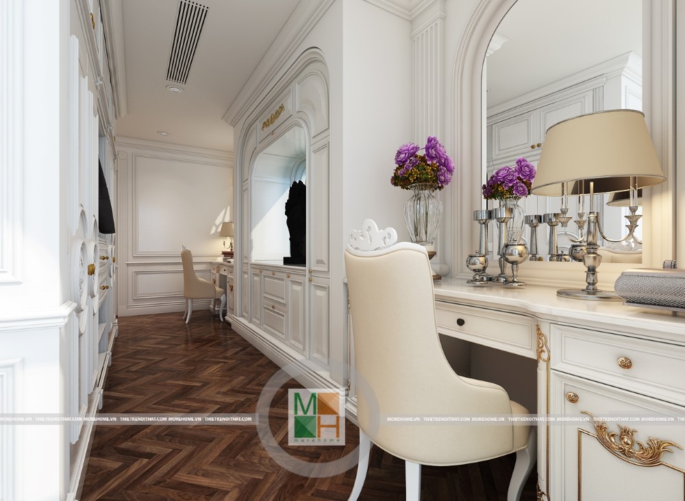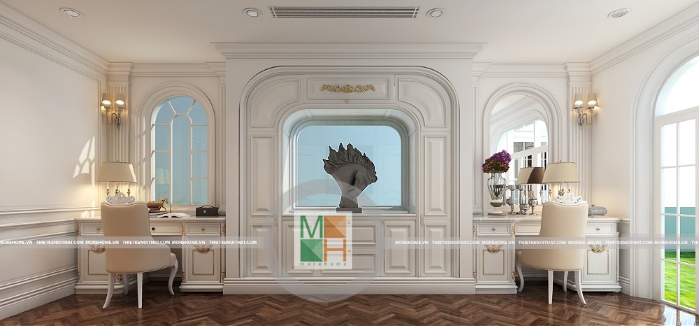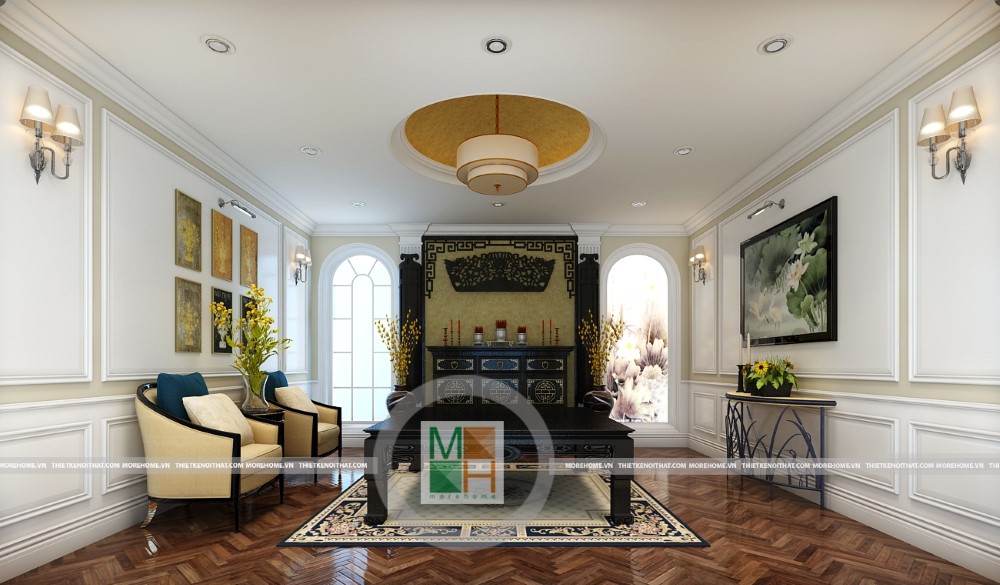 Những không gian khác trong căn nhà với thiết kế nội thất tân cổ điển như phòng thờ, hành lang, phòng đọc hay cả khu tủ quần áo cũng gây ấn tượng mạnh với gia chủ. Theo đuổi phong cách thiết kế nội thất tân cổ điển, các kiến trúc sư đã khéo léo lồng ghép nhiều chi tiết nhỏ, đan xen một cách có chủ ý định hình phong cách cho cả gia chủ và ngôi nhà. Các yếu tố đó kết hợp hài hòa với màu sắc chủ đạo, ánh sáng và các thiết kế xanh khác đã tạo nên một không gian sống sang trọng và quý phái cho gia chủ.