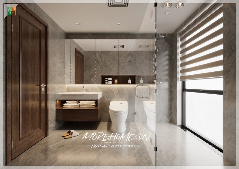 Để tạo cảm giác rộng rãi cho phòng tắm không rộng, nên lựa chọn màu sáng cho gạch lát sàn và đá ốp tường.