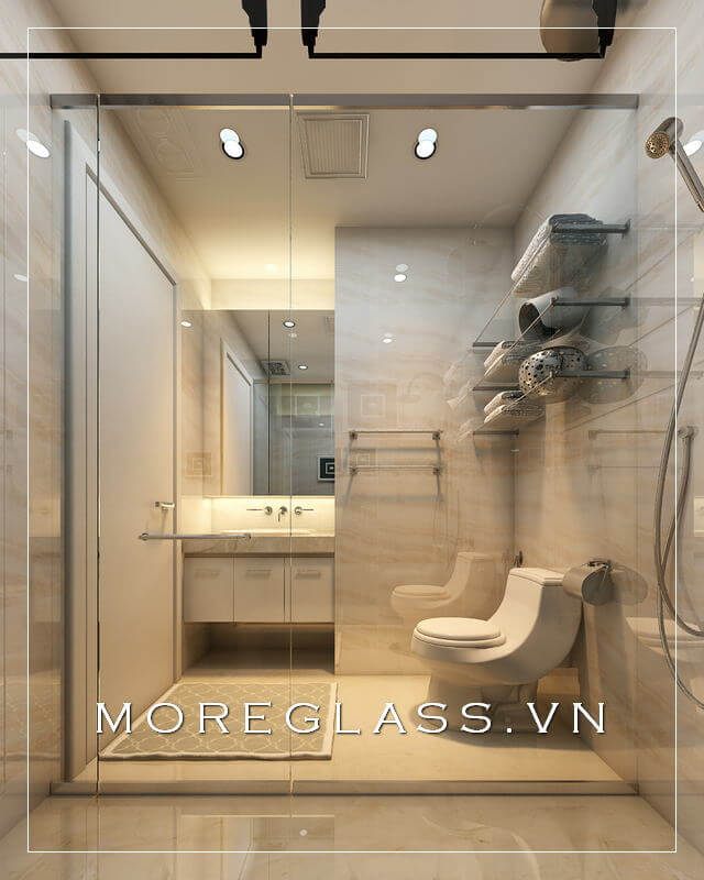 Mẫu thiết kế nhà tắm kính cường lực cao cấp có vòi hoa sen đơn giản, nhỏ gọn, tạo nên vẻ đẹp tinh tế và tiện nghi cho không gian căn phòng.
